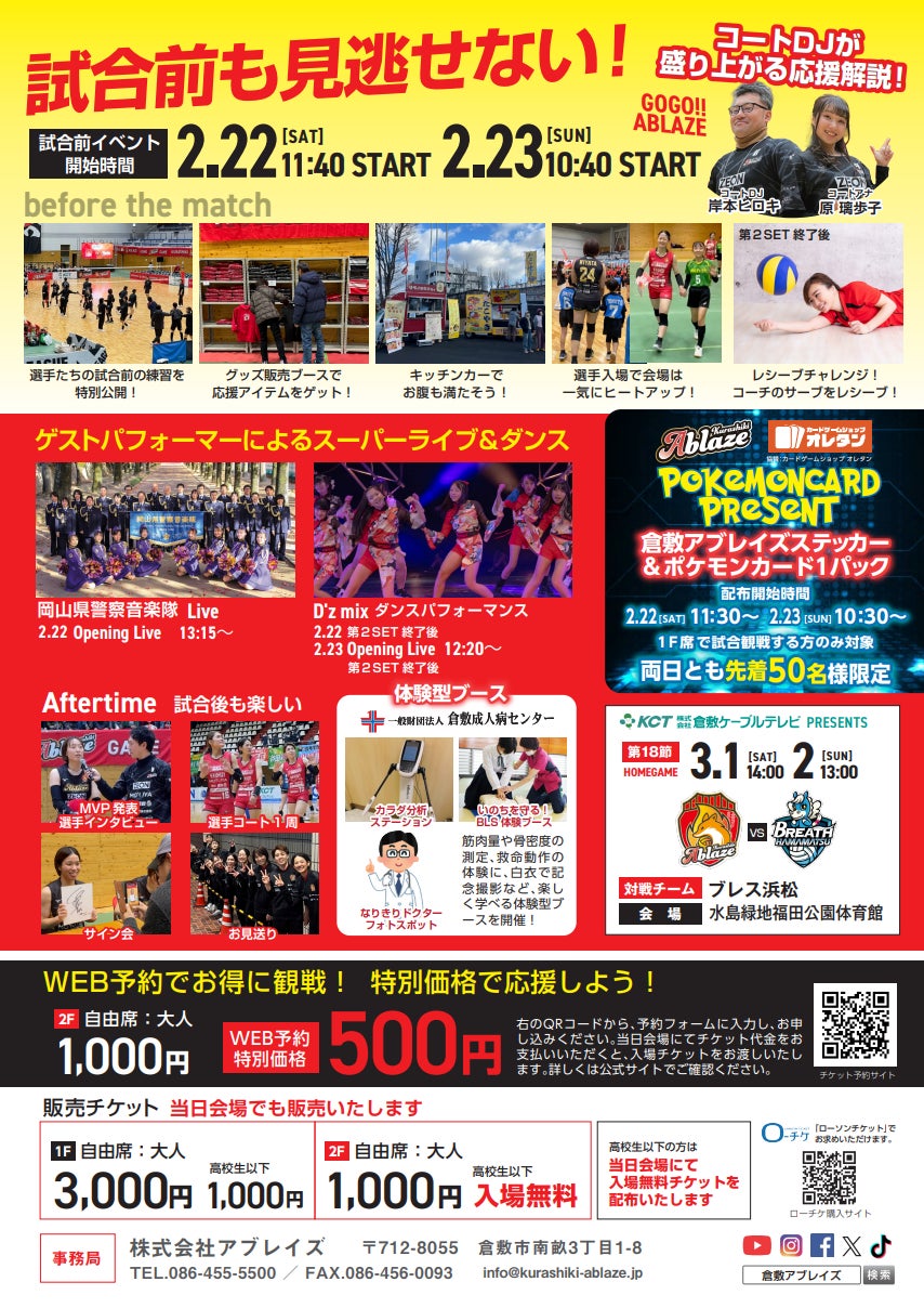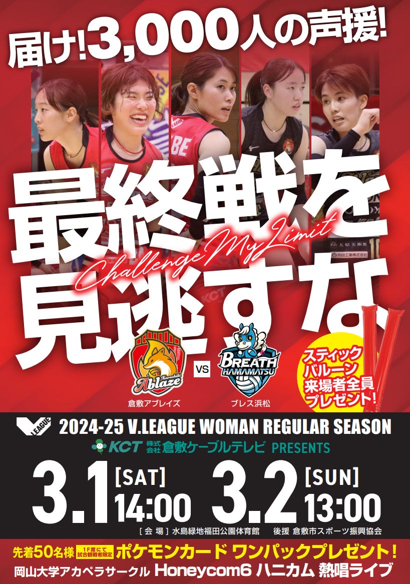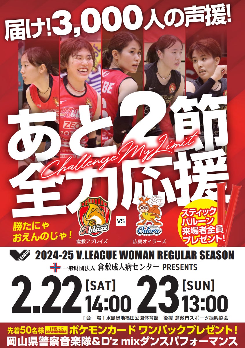 V.LEAGUE WOMEN VOLLEYBALL TEAM倉敷アブレイズは、2024-25シーズン残り2節のホームゲームに向けて、PR活動を行います!リーグ終盤に向けて、一人でも多くのファンに皆様にアブレイズの勇姿を見ていただきたくために選手が自らチラシを配布します!アブレイズの最終戦を見逃すな!!