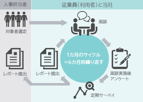 サービス | 面談(全6回: 初回面談、月1回×5回面談/1回20~40分) 面談実施後アンケート(全6回: 月1回実施) 定期サーベイ(全6回: 月1回実施) |