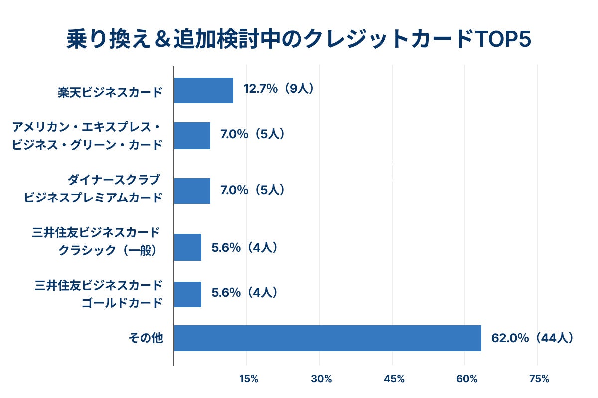 検討中カードの上位には、楽天ビジネスカードやアメリカン・エキスプレス、ダイナースといったブランド力や特典に強みを持つカードが並びます。現行カードへの満足度が高い中でも、「特定の魅力的な付加価値」があれば関心を示す層が一定数存在します。つまり、乗り換えの動機は総合的不満よりも、魅力的な提案やサービスの追加に起因するケースが多いと考えられます。