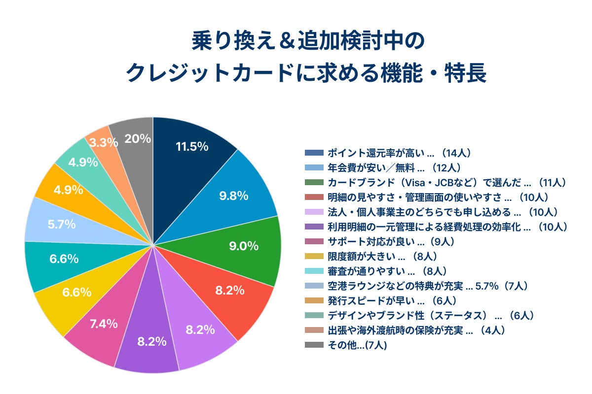 最も多かったのは「年会費が安い/無料」で11.4%と、コスト意識の高さが明確に表れています。中小企業や個人事業主にとっては、固定費の削減が経営安定化の基盤であり、「年会費を抑えながらポイント還元がある」カードは非常に魅力的です。