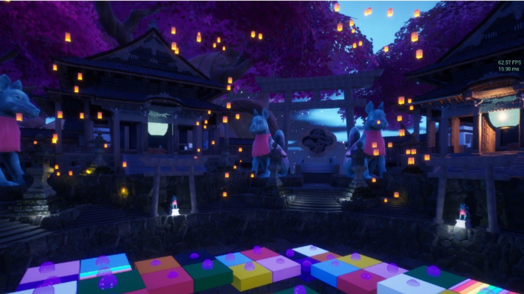 当社は華やかなデジタルアートにより幻想的にショーアップされた豊川稲荷を会場として行われる「eSports MO-DE in ヨルモウデ™」のメタバース会場をFortniteマップ上に制作しました。現実世界の「ヨルモウデ」で豊川稲荷に実施されるプロジェクションマッピングをメタバース空間でも再現すべく、モデリング素材の使用やエフェクトを導入など、クリエイティブ2.0(UEFN)ならではの技術と表現方法で、幻想的な空間を演出いたしました。また単なるメタバース上の観光にとどまらず、色遊びゲームとして実装しました。幻想的で美しい空間をお楽しみいただきながら、ゲームにチャレンジし高得点をめざしてください。