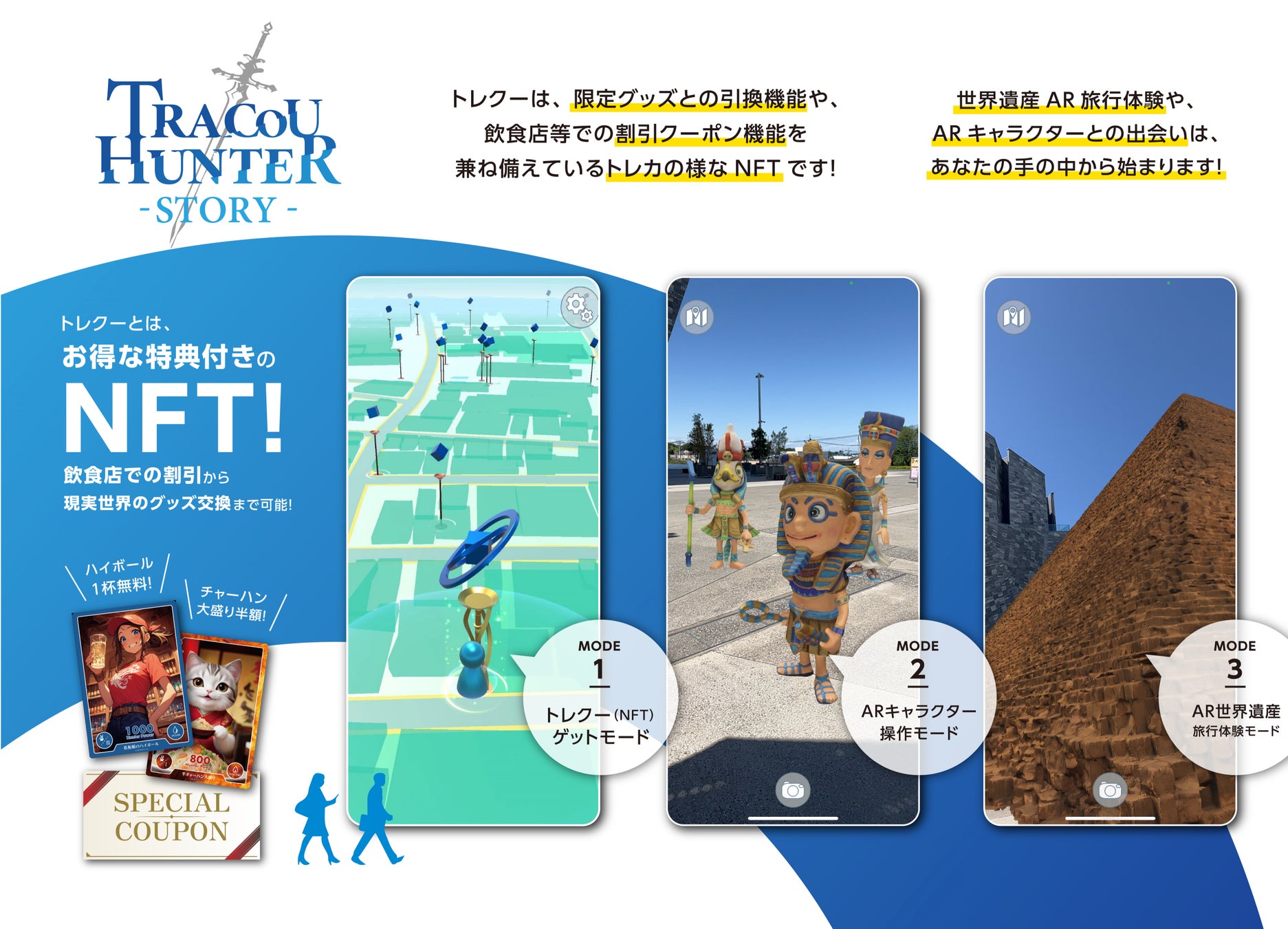 スマートフォンの位置情報を使用しながら移動することで、各地に配置されているピンを巡るアプリケーションです。ピンでは、商品との引き換えやクーポンとして使用できる特典付きのNFT「トレクー」やARコンテンツの体験ができます。トレクーをコレクションしたり、世界各所の遺跡や遺物などを精巧にスキャンした3DデータをARで身近に体験したり、様々な楽しみ方が可能です。