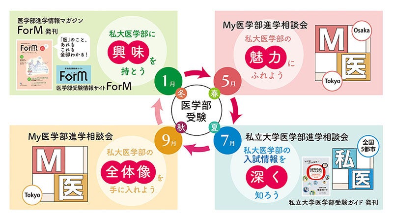 【春】から早期に情報収集できる場を提供し、【夏】の進学相談会と受験ガイド、そして【秋】の「My医学部進学相談会‐秋‐」へとつなげていきます。