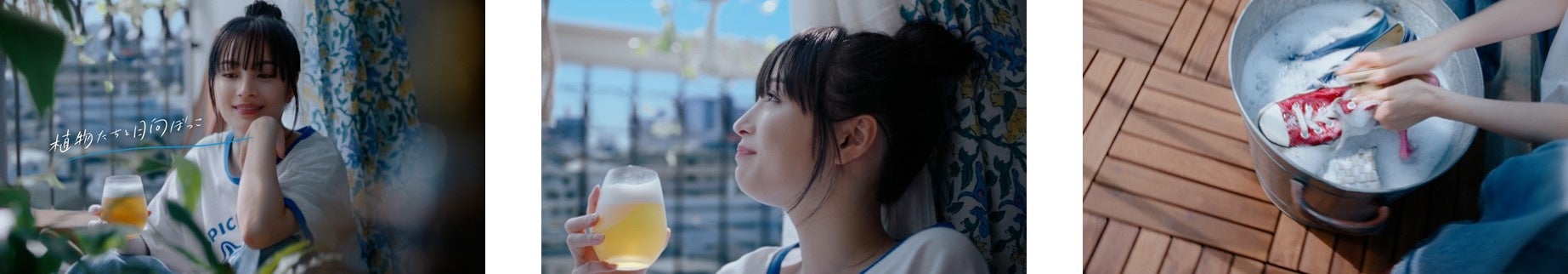 晴れやかな青空のもと、ラフなTシャツ姿でリラックスした演出!香るエールを片手に自由時間を楽しむ広瀬さんの表情に注目