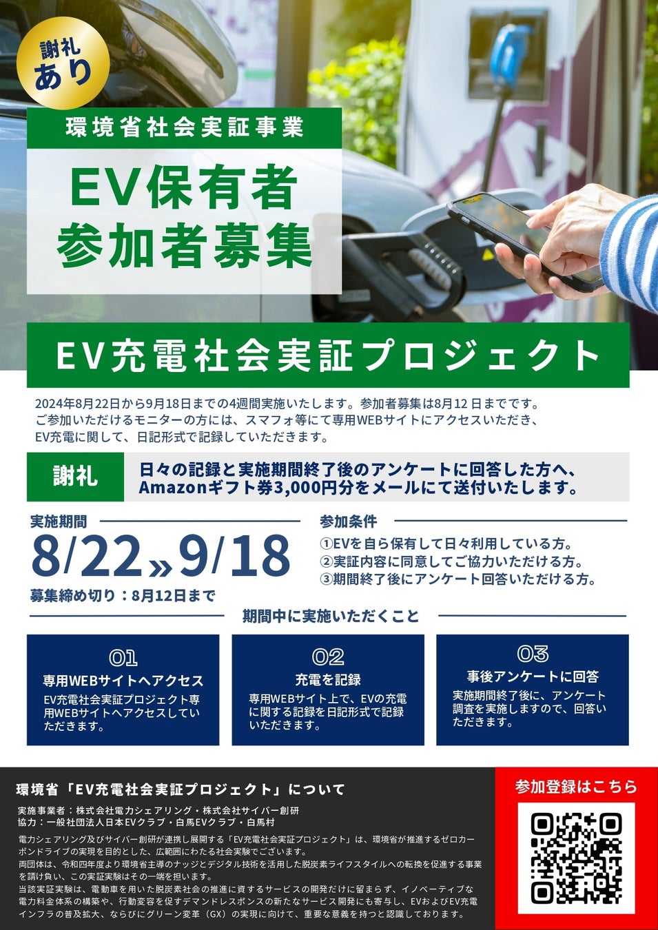 株式会社電力シェアリングは、長野県白馬村・日本EVクラブの協力を得て、EV充電の最適化のための社会実証実験モニターを募集しています。