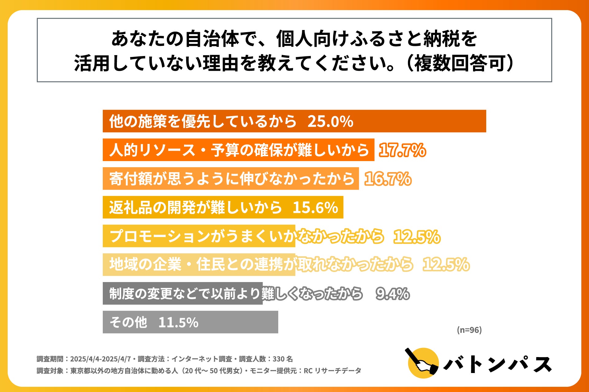 続いて、自治体で個人向けふるさと納税を活用していないと回答された方に「個人向けふるさと納税を活用していない理由」を尋ねる設問への回答では、1位が「他の施策を優先しているから」で25.0%、2位が「人的リソース・予算の確保が難しいから」で17.7%、3位が「寄付額が思うように伸びなかったから」で16.7%という結果になりました。この結果から、自治体で個人向けふるさと納税を活用していない理由として、「他の施策を優先しているから」が多いことがわかりました。