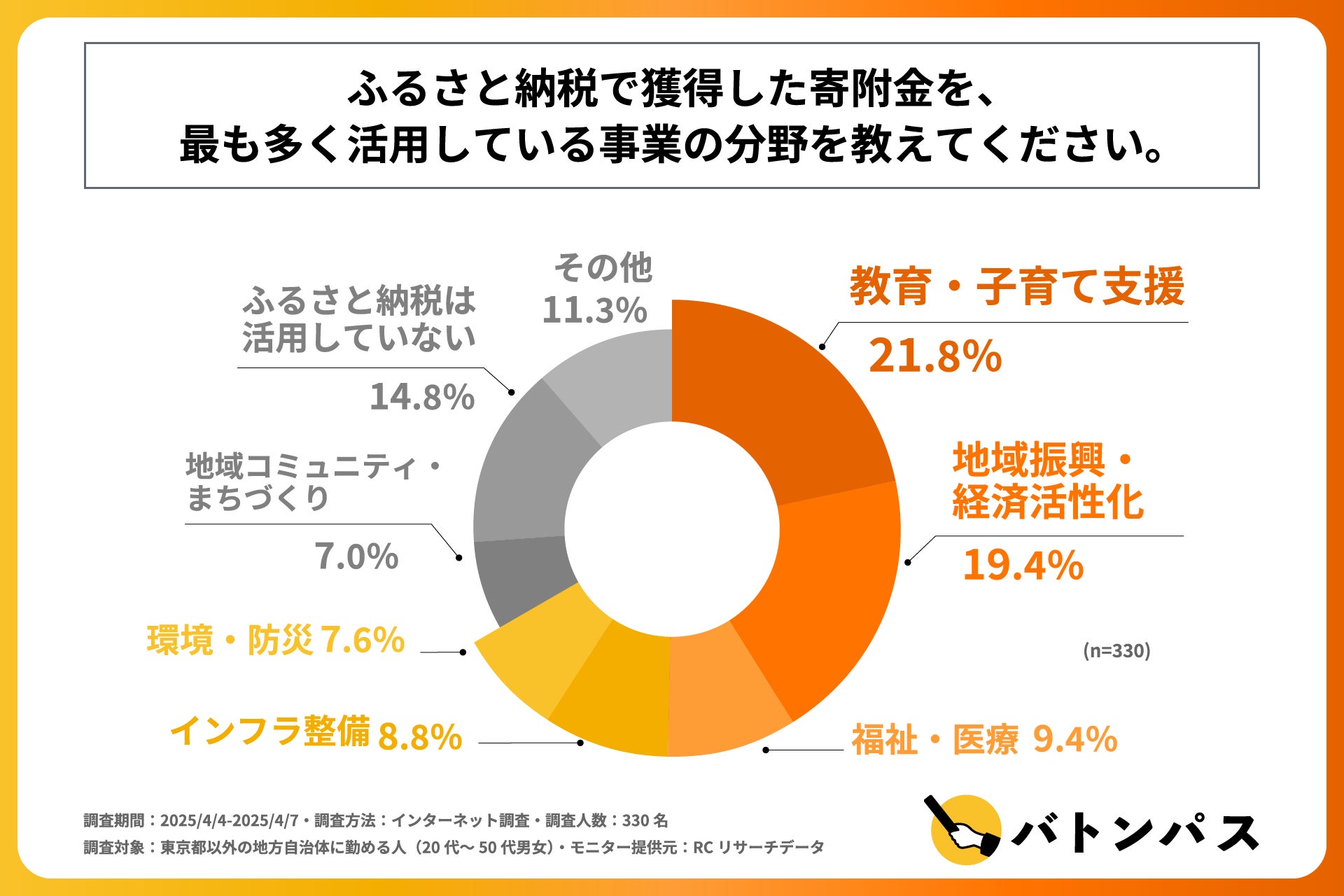 調査の最後、「ふるさと納税で獲得した寄付金を、最も多く活用している事業の分野」を尋ねる設問への回答では、1位が「教育・子育て支援」で21.8%、2位が「地域振興・経済活性化」で19.4%、3位が「ふるさと納税は活用していない」で14.8%という結果になりました。この結果から、東京都以外の地方自治体がふるさと納税で獲得した寄付金を活用する先としては「教育・子育て支援」や「地域振興・経済活性化」が多いことがわかりました。