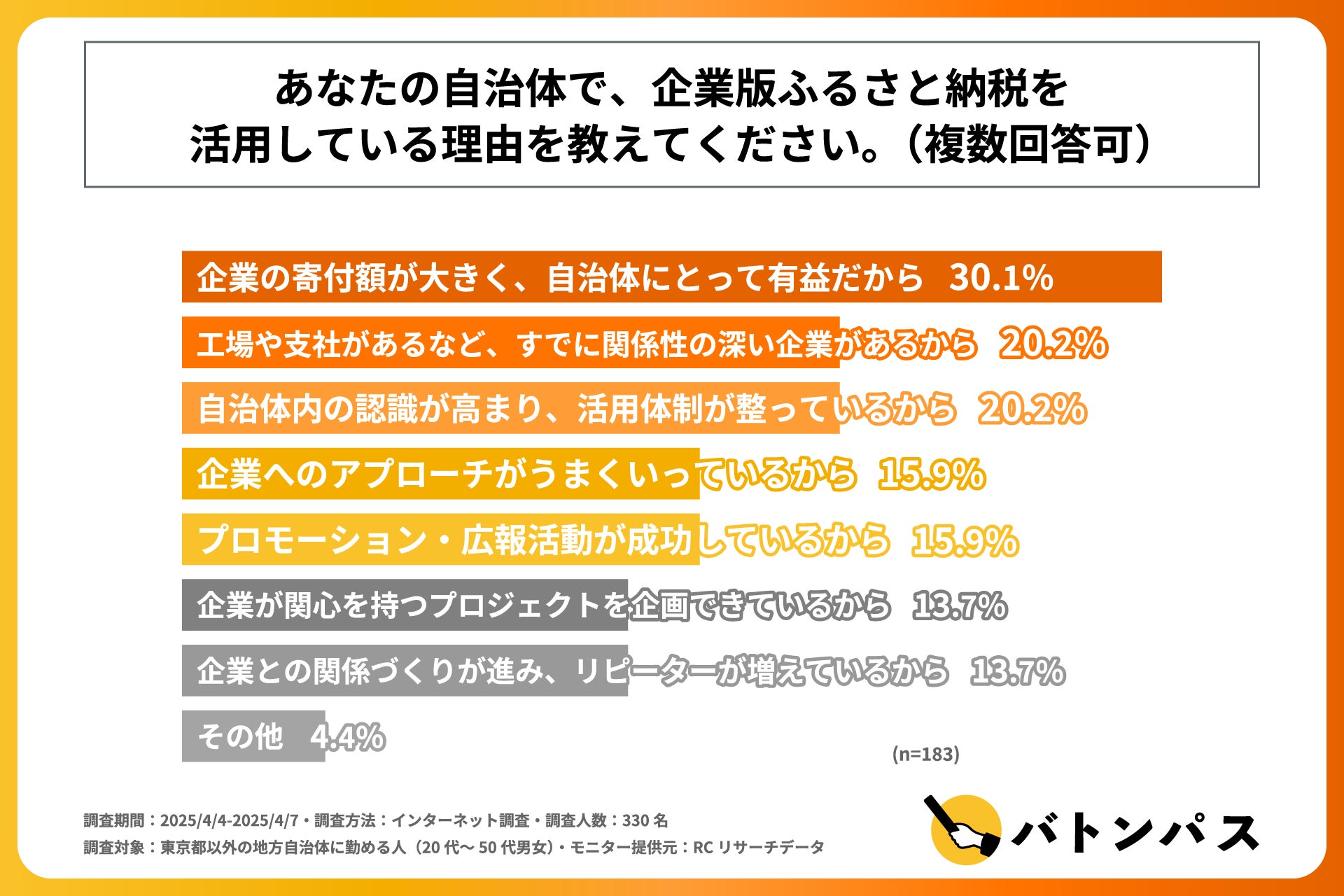 次に、自治体で企業版ふるさと納税を活用していると回答された方に「自治体で、企業版ふるさと納税を活用している理由」を尋ねる設問への回答では、1位が「企業の寄付額が大きく、自治体にとって有益だから」で30.1%、2位が同率で「工場や支社があるなど、すでに関係性の深い企業があるから」、「自治体内の認識が高まり、活用体制が整っているから」で20.2%、3位が同率で「企業へのアプローチがうまくいっているから」、「プロモーション・広報活動が成功しているから」で15.9%という結果になりました。この結果から、企業版ふるさと納税を活用している理由は多岐にわたることがわかりました。