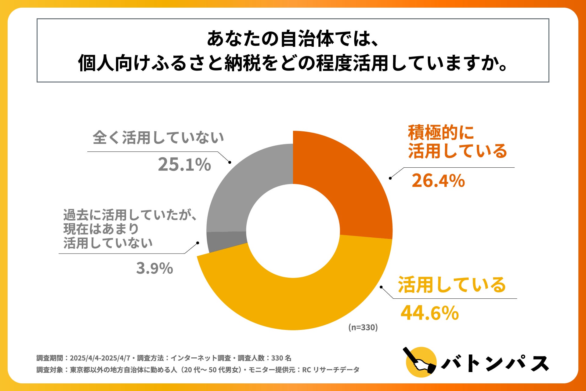 プランプラン株式会社(本社:東京都港区 、代表取締役:川島 寛貴)が運営する「バトンパス」は、東京都以外の地方自治体に勤める20代~50代の男女を対象に「地方自治体のふるさと納税活用実態」に関する調査を実施しました。この調査結果から、東京都以外の地方自治体のふるさと納税活用実態などが明らかになりました。