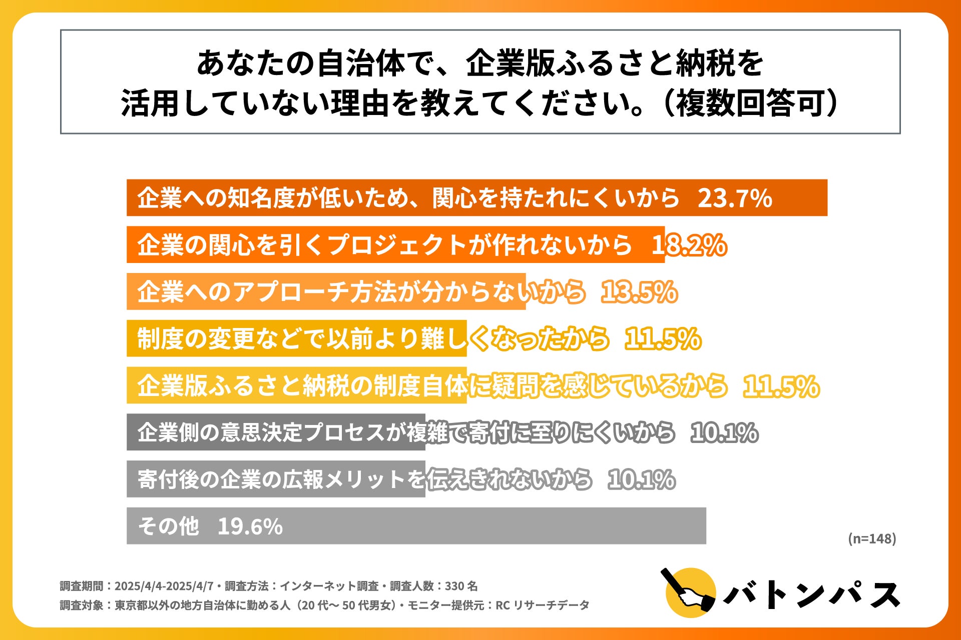 また、自治体で企業版ふるさと納税を活用していないと回答された方に「自治体で、企業版ふるさと納税を活用していない理由」を尋ねる設問への回答では、1位が「企業への知名度が低いため、関心を持たれにくいから」で23.7%、2位が「企業の関心を引くプロジェクトが作れないから」で18.2%、3位が「企業へのアプローチ方法が分からないから」で13.5%という結果になりました。この設問では、企業との関係構築ができないことに起因する理由が上位に並ぶ結果となりました。