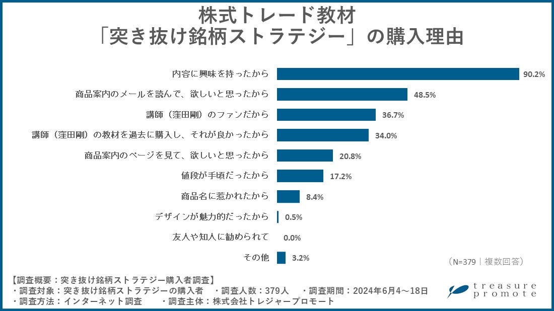 本商品は、「株の学校ドットコム」の受講生、「カブケーションズオンラインスクール」の受講生に先行販売を実施しました。購入理由として最も多かったのは「内容に興味を持ったから」で342件(90.2%)でした。