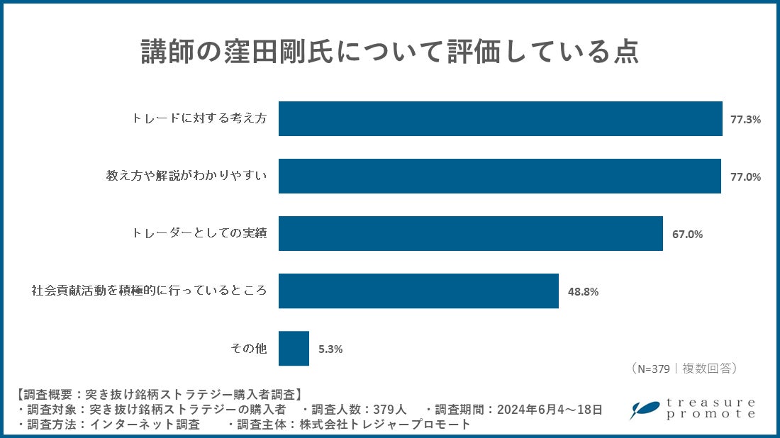次に、講師の窪田剛氏に対する評価については、「トレードに対する考え方」を評価する人が293(77.3%)で最も多く、僅差で「トレーダーとしての実績」が292名(77.0%)となりました。