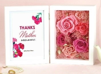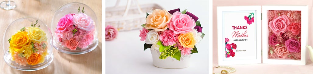 プリザーブドフラワーはお手入れ不要で長期間美しい状態が保てることからもギフトに最適で、ベル・フルール銀座本店では、現在母の日のギフトを求めて多くの方に来店いただいています。母の日定番のバラとカーネーションを使用したアレンジメントをはじめ、ホコリが付きにくいガラスドームに入ったものや、写真を入れて贈れるフォトフレームなど、バリエーション豊かに取り揃え、人気となっています。