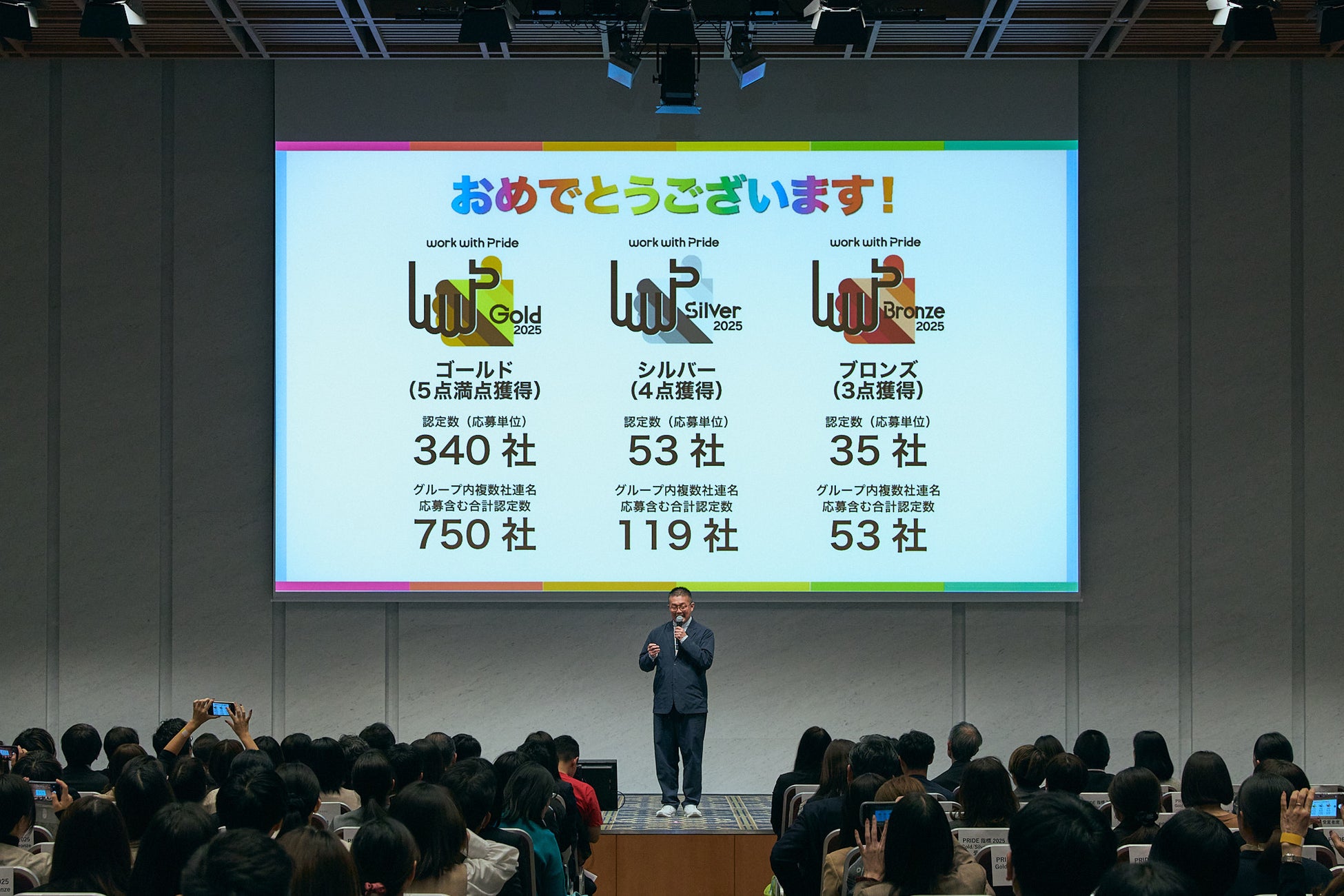 カンファレンスの終盤には、一般社団法人work with Pride 代表理事 松中 権より『PRIDE指標 2025』のゴールド・シルバー・ブロンズ認定企業の発表や『PRIDE指標2025』の総評・表彰を行った他、『レインボー認定』表彰を実施しました。