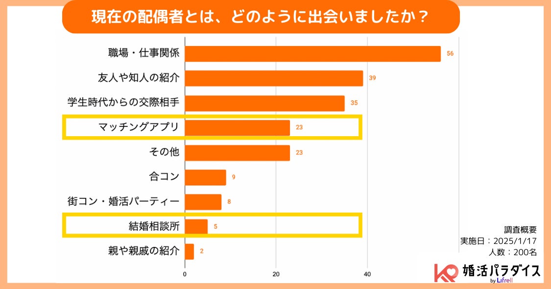 「職場・仕事関係」や「友人・知人の紹介」「学生時代からの交際」など、いわゆる自然な出会いによる結婚が依然として多い一方、マッチングアプリや結婚相談所を通じた結婚はまだ少数にとどまっています。ただし、マッチングアプリ経由の出会いは合コンを上回る結果も見られ、出会いの手段として社会に浸透しつつあることがうかがえます。