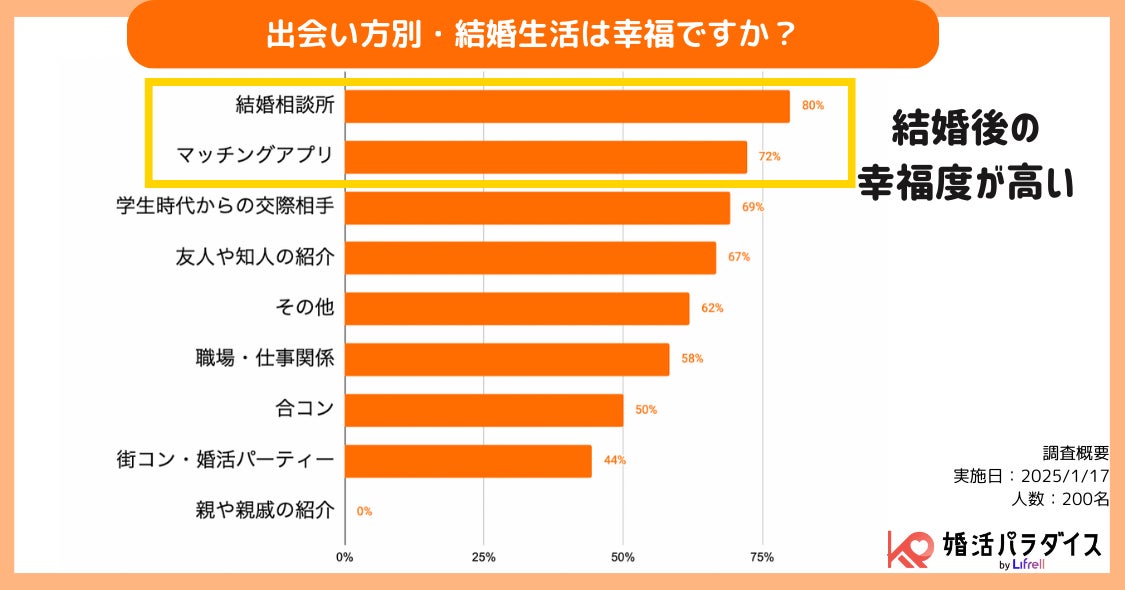【結婚に関するアンケート】「マッチングアプリ・結婚相談所組は1年未満で結婚28.6%」 幸福度も高水準に — LIFRELL調査