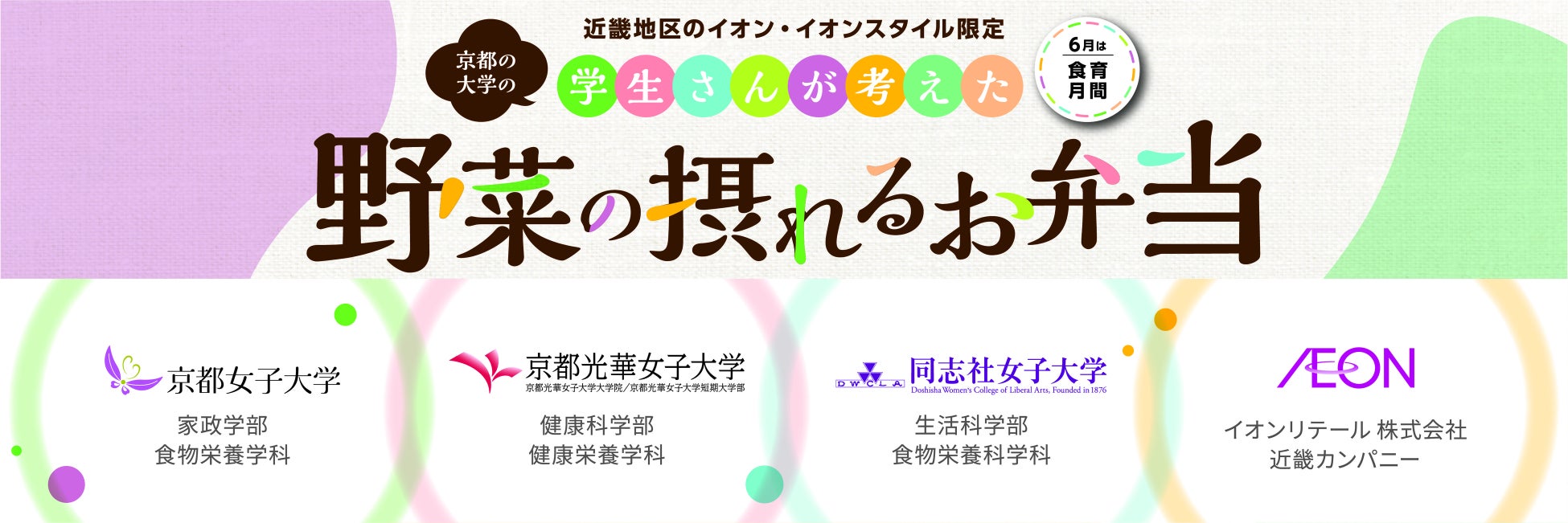 この取り組みは、京都市が「健康長寿のまち・京都」を実現するために市民ぐるみで推進している健康づくりの一環で、本学が2020年8月に京都市と締結した「「食」を通じた地域活性化と人材育成に関する包括連携協定」に基づいた取り組みです。イオンリテール(株)と京都市、そして本学と他2大学の産・官・学とが連携し、計6種類のお弁当を販売することになりました。