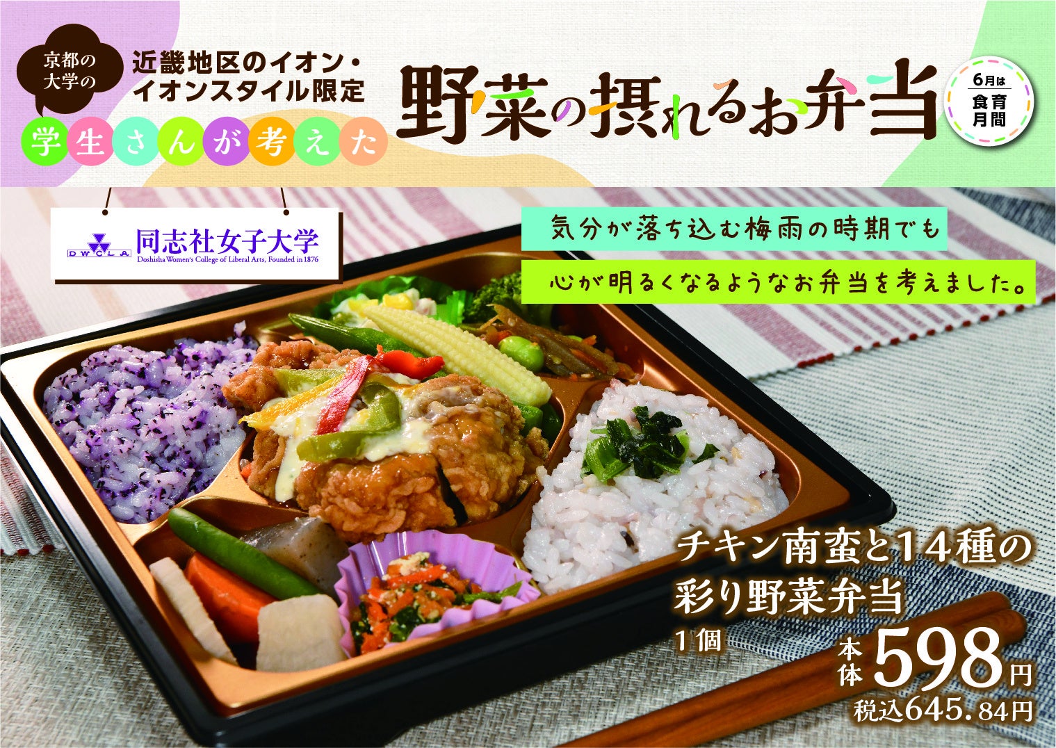 5月31日(水)からは第一弾として、3種類が販売開始。本学学生が考案した「チキン南蛮と14種の彩り野菜弁当」は、本体価格598円(税込み645円)で販売しています。