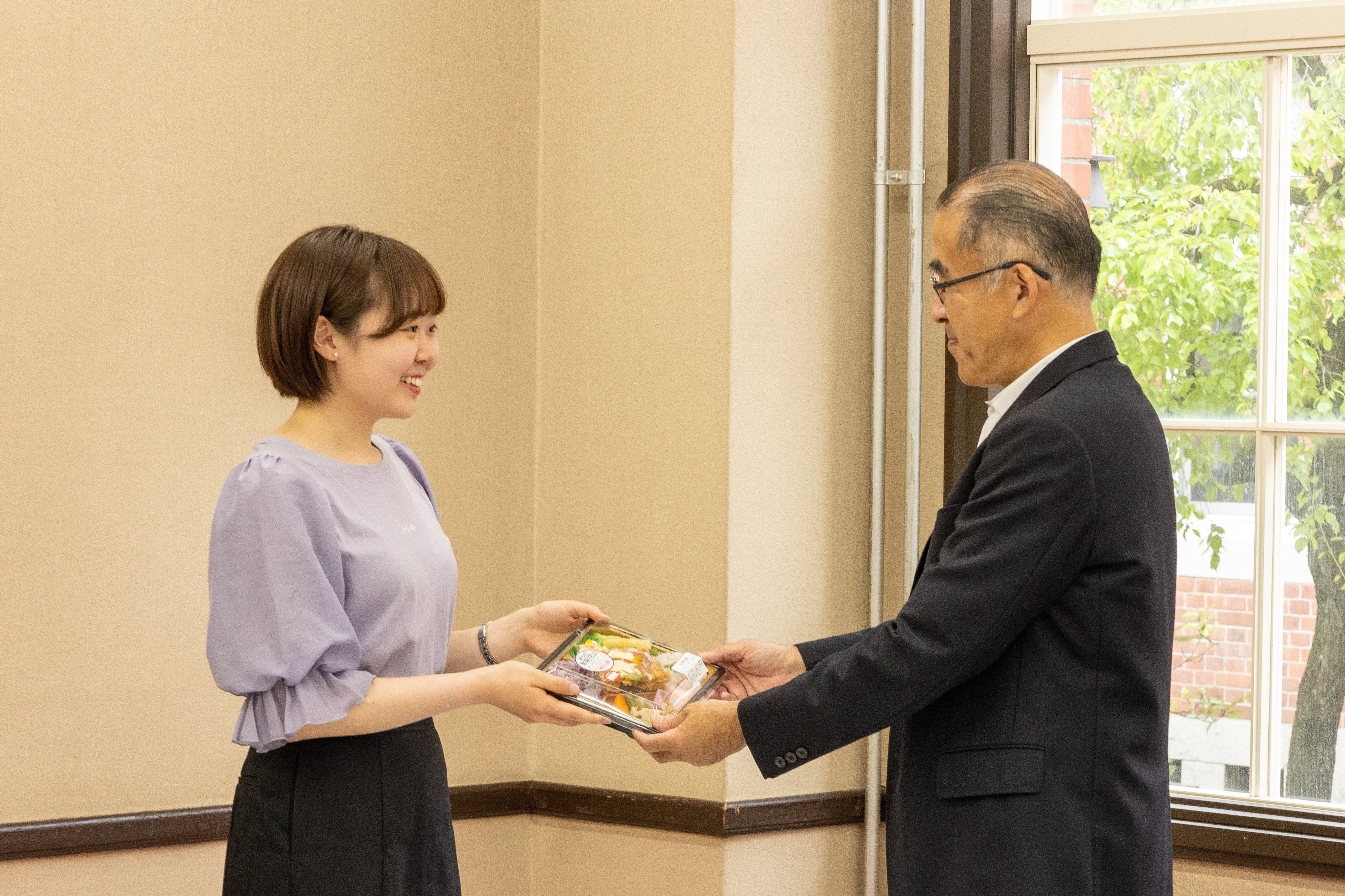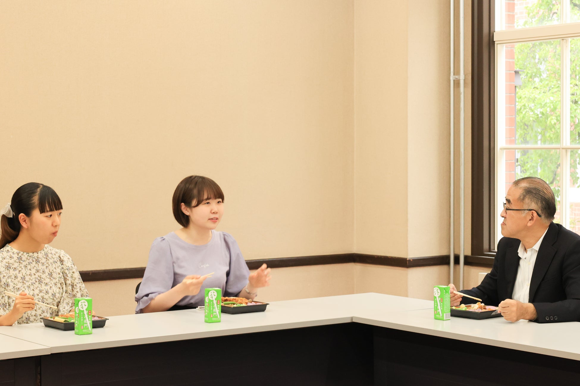 6月1日(木)には、メニュー考案学生2名が小﨑眞学長とともにお弁当を食し、活動報告を行いました。