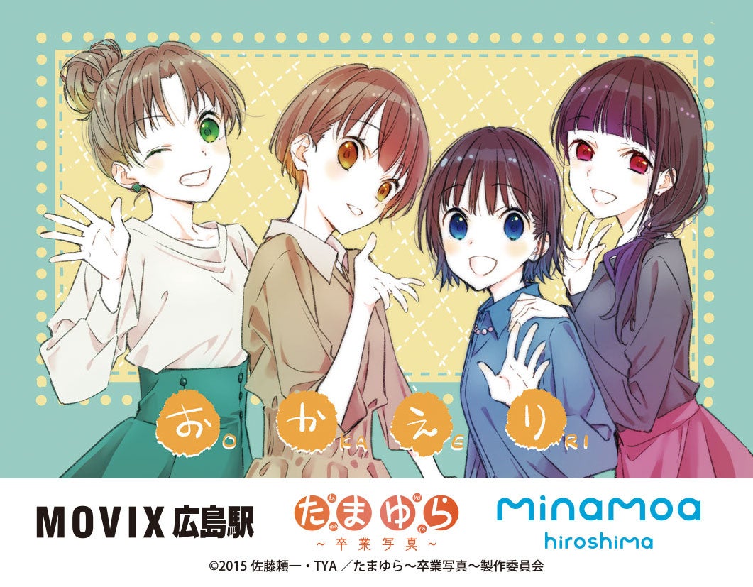 広島県竹原市を舞台にした大人気アニメ「たまゆら」。2015年より順次公開された「完結編4部作」を一挙リバイバル上映致します。MOVIX広島駅グランドオープンを記念した入場者プレゼント「クリアカード」を3種週替わりで配布致します。