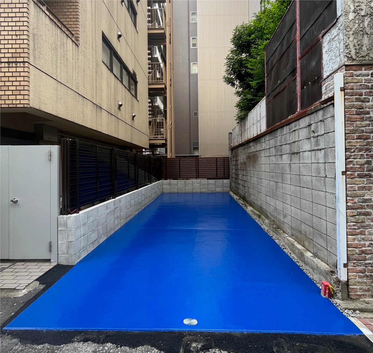 SHUTLの向かいにある屋外フリースペース。目をひくブルーの床面を基調に、若い未完成の感性を伸ばすための実験場。