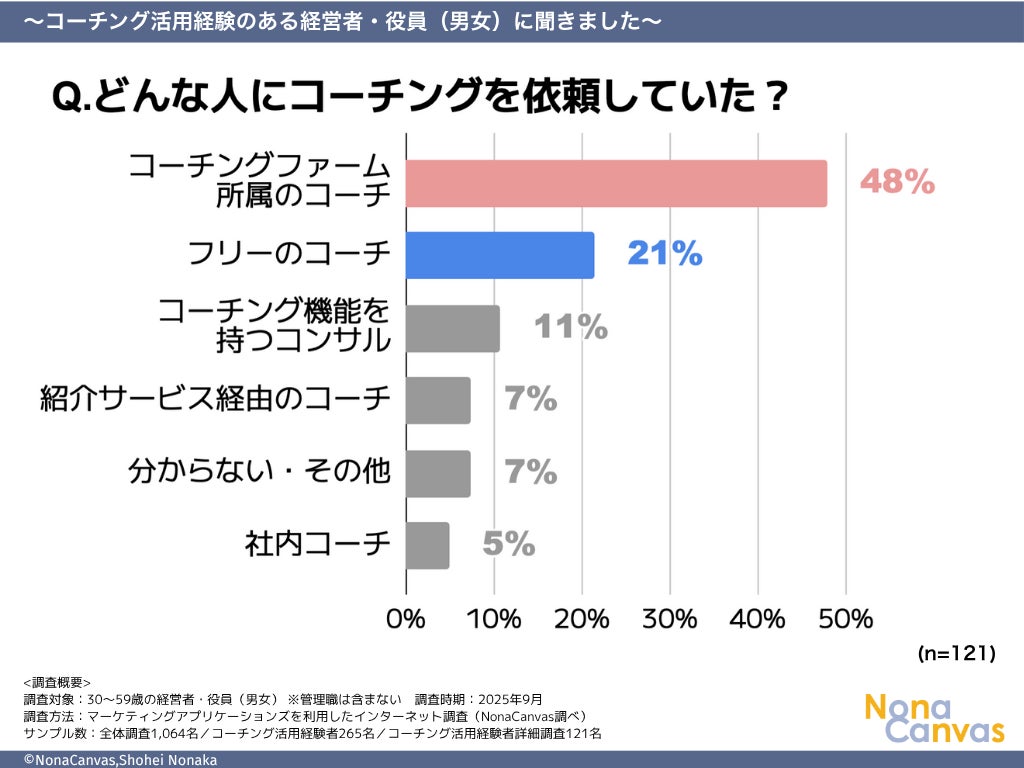 コーチングファーム経由が約半数(48%)を占める一方、フリーランスのコーチ(21%)も一定の市場シェアを持っていることがわかります。