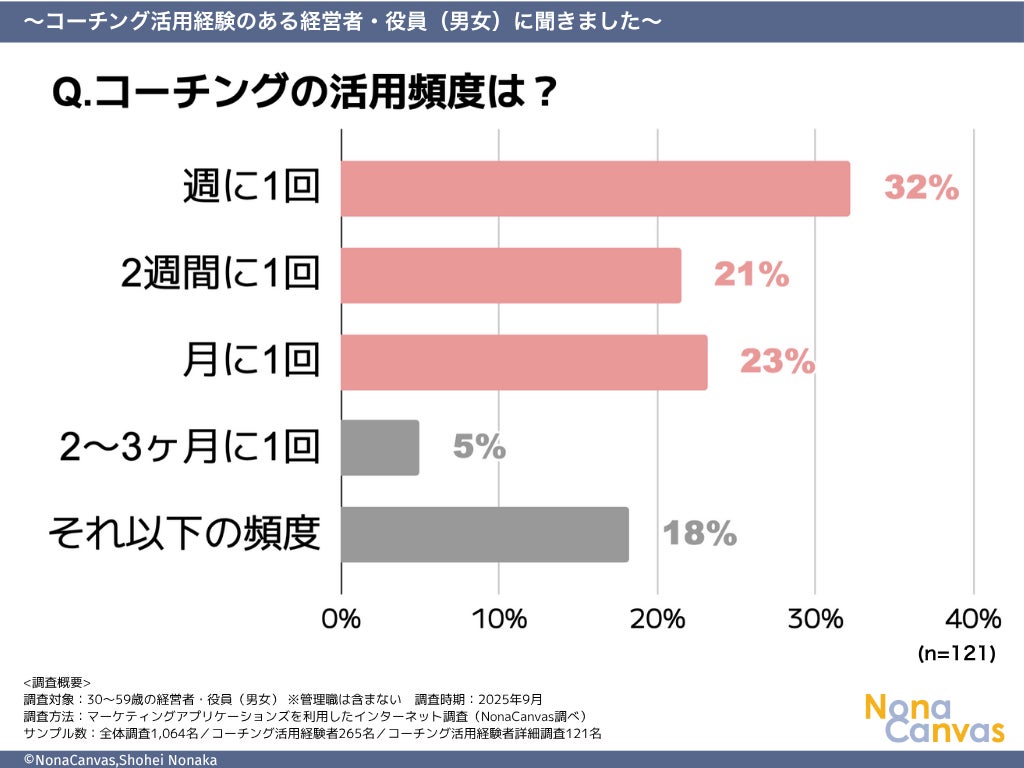 週1回が最多(32%)という結果は、コーチングが経営における継続的な対話パートナーとして位置づけられていることを示しています。また、隔週(21%)、月1回(23%)という頻度も一定数存在することから、経営者の状況や課題に応じて柔軟に頻度を調整していることがわかります。