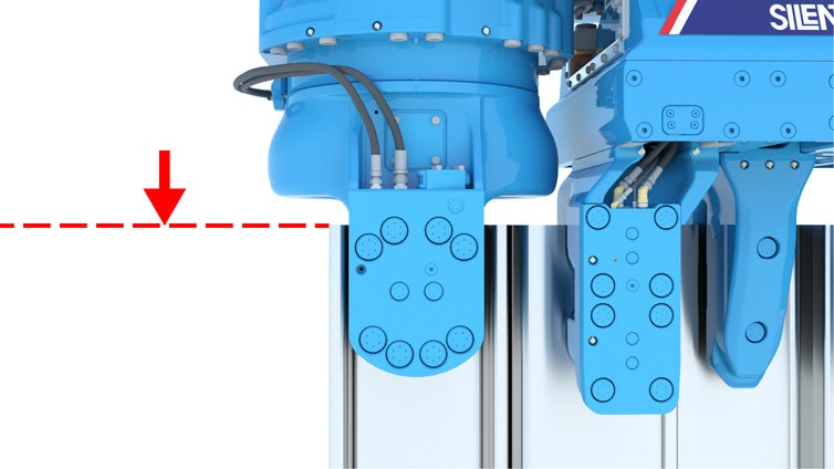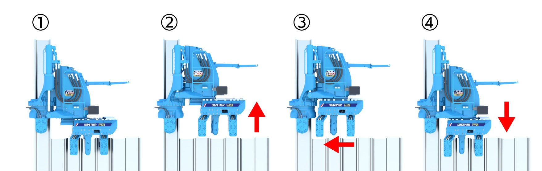 1台の機械で「単独圧入」、「ウォータージェット併用圧入」、「硬質地盤圧入」の3種類の工法が選択できる、複合式の U形鋼⽮板400 ㎜幅対応機です。特に需要の高いN値(地盤の硬さ)50〜250程度の砂礫層・玉石層等に最適な軽量・コンパクトな機械となっており、N値250〜600程度の地盤をターゲットとした「サイレントパイラー™ F112」より2450㎏軽量化。高い機動性を実現しています。