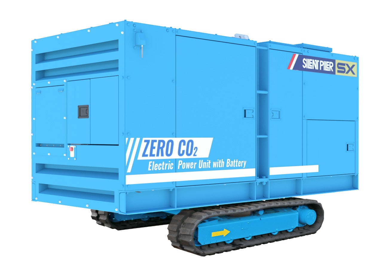 ST400SX(定格出力155kW)クラスの油圧式杭圧入引抜機「サイレントパイラー™」の動力源です。ディーゼルエンジンではなく、電動モーターで油圧ポンプを駆動して機械の油圧動力を得るため、CO₂を排出しません。さらに、バッテリー式で大型電源や給電ケーブルが不要なことから、現場導入が容易となり、ゼロエミッション圧入施工の現場を大幅に拡大します。また、静粛性が高く、騒音値は国土交通省の超低騒音基準値(98dB)を15dB下回り、従来のエンジン式パワーユニットと比較しても8dB低減。なお、バッテリー式電動パワーユニットは他クラスへの展開も順次予定しています。