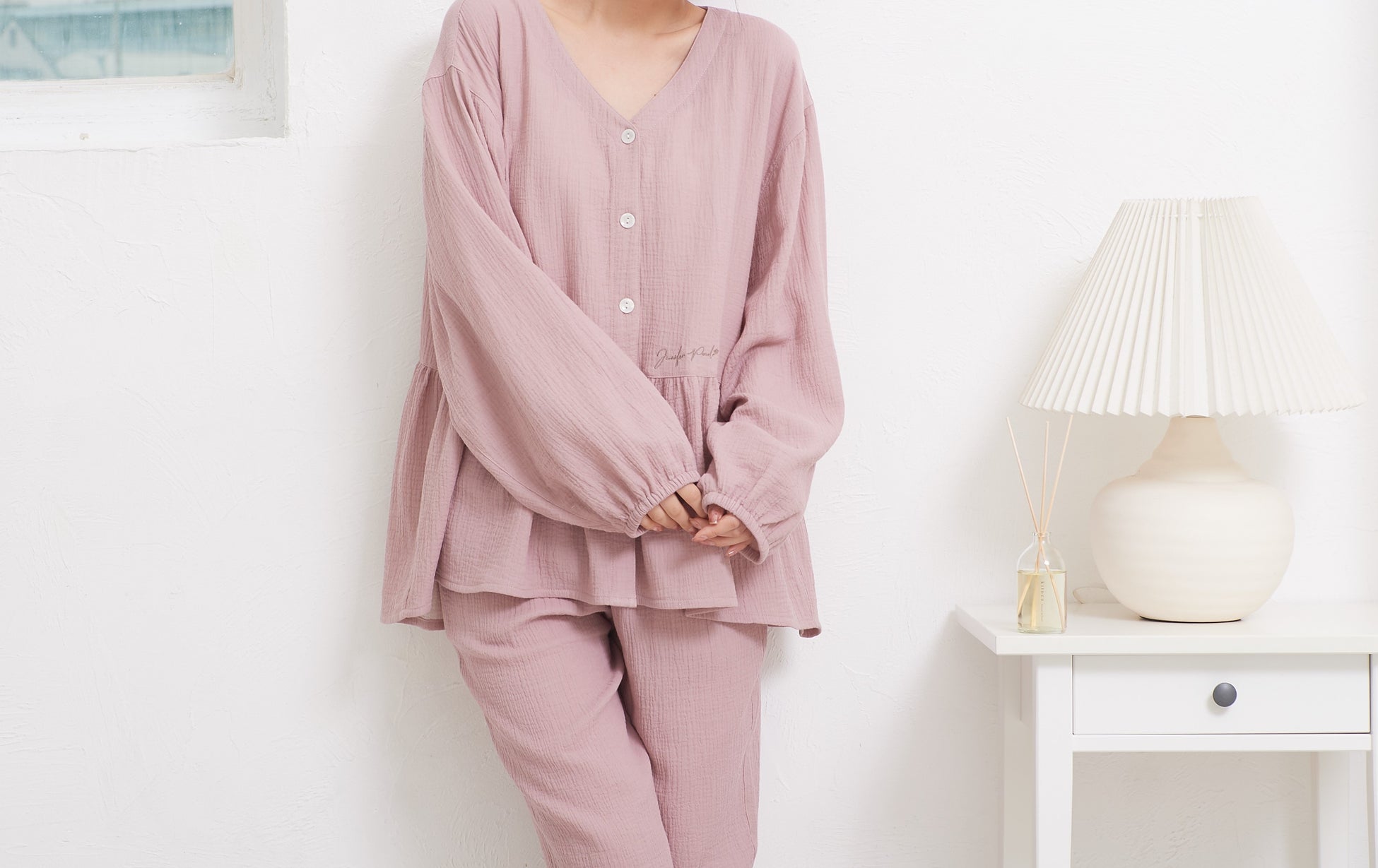 肌ざわりふわふわ!楊柳ガーゼ素材のルームウェア「スフリー」は、ふんわりシルエットが抜群に可愛い。前開きのパジャマタイプで、おしりも隠れるシルエットは気になる体型も隠してくれます。