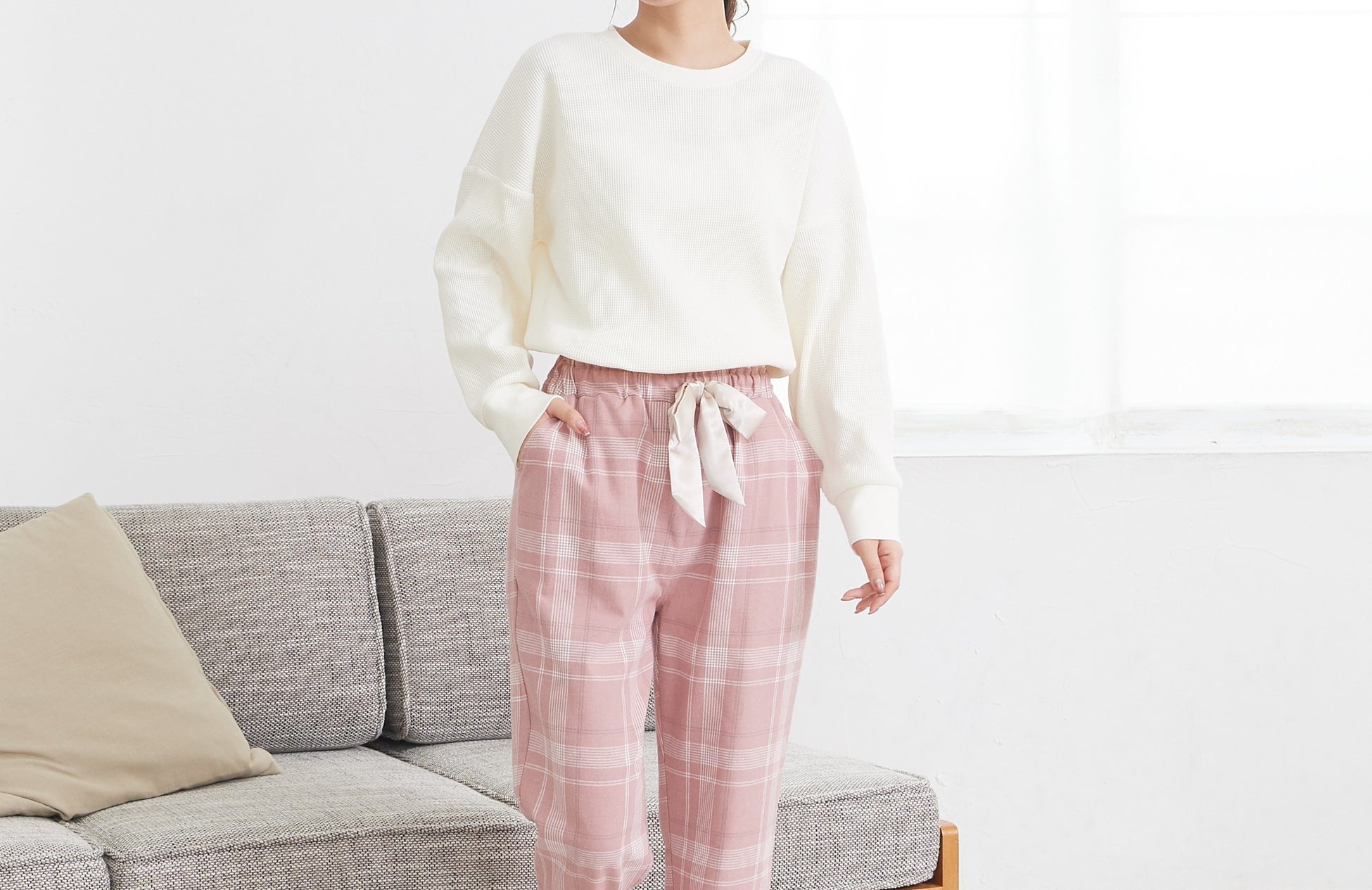 ワッフル素材のトップスと柔らかパンツの「セラム」は、上下ともコットン100%でありながら素材感に差をつけた、人目についてもおしゃれなワンマイル対応のルームウェア。