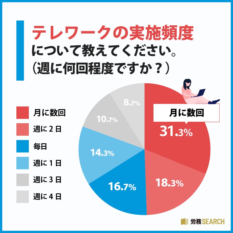 まず、テレワークの実施頻度について教えてくださいと質問してみたところ、最も多かった回答は「月に数回」で31.3%、次いで「週に2日」が18.3%という結果となり、週に1~2回程度テレワークを実施している企業が約半数を占めていました。