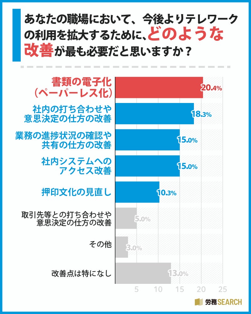 最後に、あなたの職場において、今後よりテレワークの利用を拡大するためには、どのような改善が最も必要だと思いますか?という質問をしてみたところ、「書類の電子化(ペーパーレス化)」が20.4%と最も多く、次いで「社内の打ち合わせや意思決定の仕方の改善」が18.3%、「業務の進捗状況の確認や共有の仕方の改善」と「社内システムへのアクセス改善」が同率で15.0%という結果になりました。