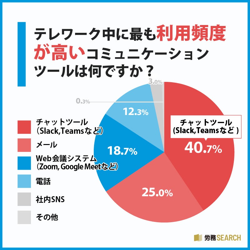 そこで次に、テレワーク中に最も利用頻度が高いコミュニケーションツールは何ですか?という質問をしてみたところ、最も人気が高かったのはSlackやTeamsなどの「チャットツール」で40.7%、次いで「メール」が25.0%、ZoomやGoogle Meetなどの「Web会議システム」が18.7%という結果になりました。