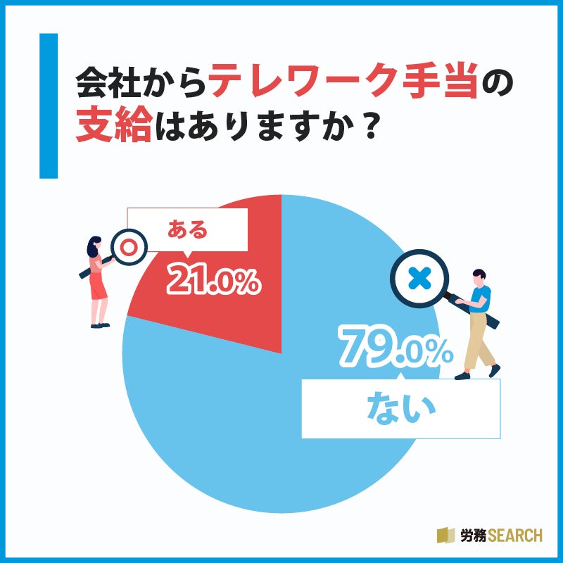 ”テレワーク手当”については、支給が「ない」企業が79.0%と圧倒的に多く、「ある」企業は21.0%という結果でした。テレワーク導入が進んでいる一方で、手当の支給は必ずしも一般的ではないことがわかります。