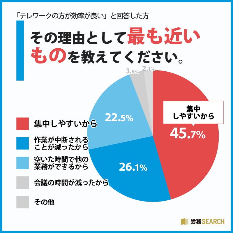 テレワークの方が効率が良いと感じる理由としては、第1位が「集中しやすいから」で45.7%、第2位は「作業が中断されることが減ったから」で26.1%、第3位は「空いた時間で他の業務ができるから」で22.5%という結果になりました。