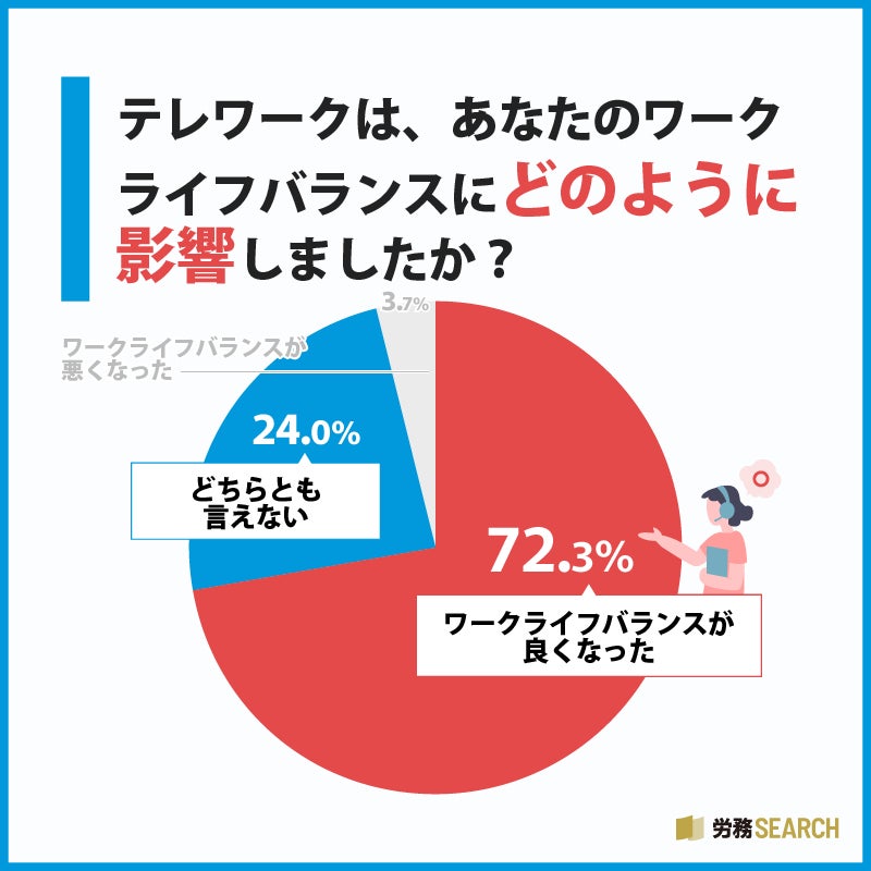 ・テレワークの実施により、72.3%が「ワークライフバランスが良くなった」