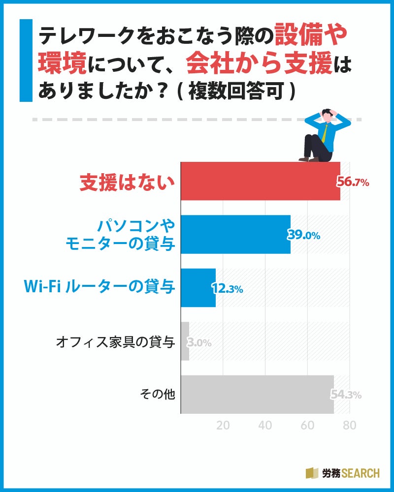 また、テレワークをおこなう際の設備・環境についても、「支援はない」と回答した人が56.7%と半数以上を占めています。