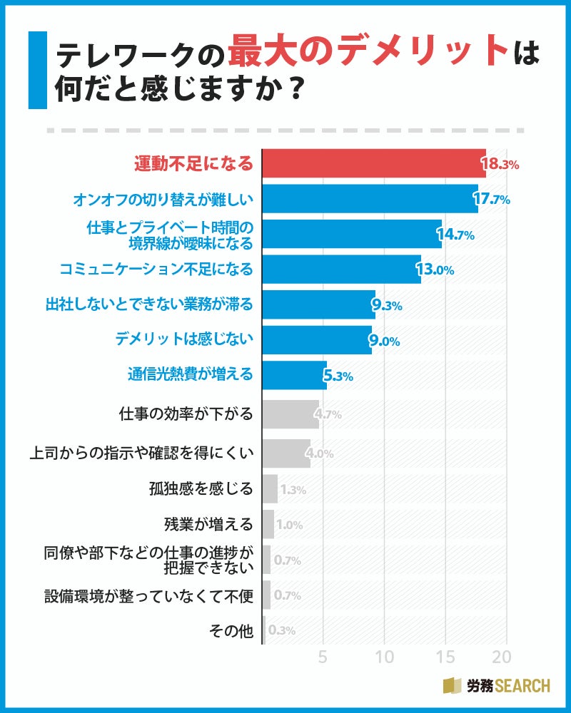 しかし、通勤や移動時間がなくなることは、弊害もありそうです。なぜなら、テレワークのデメリットの第1位は「運動不足になる」でした。次いで、僅差で「オンオフの切り替えが難しい」が第2位、「仕事とプライベート時間の境界線が曖昧になる」が第3位、「コミュニケーション不足になる」が第4位という結果になりました。