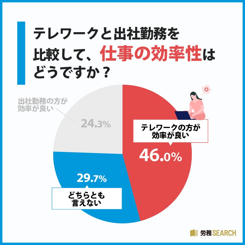・「テレワークの方が効率的」は46.0%、「出社勤務の方が効率的」は24.3%