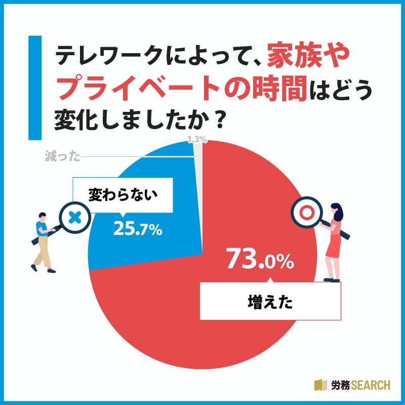 次に、テレワークはあなたのワークライフバランスにどのように影響しましたか?という質問をしてみたところ「ワークライフバランスが良くなった」が72.3%と、テレワークで働くことによって、7割以上の方がワークライフバランスが改善されたと感じていることがわかりました。さらに、家族やプライベートの時間の変化についても尋ねたところ、「増えた」と回答した人が73.0%と、こちらもプラスに改善した方が多いことがわかりました。