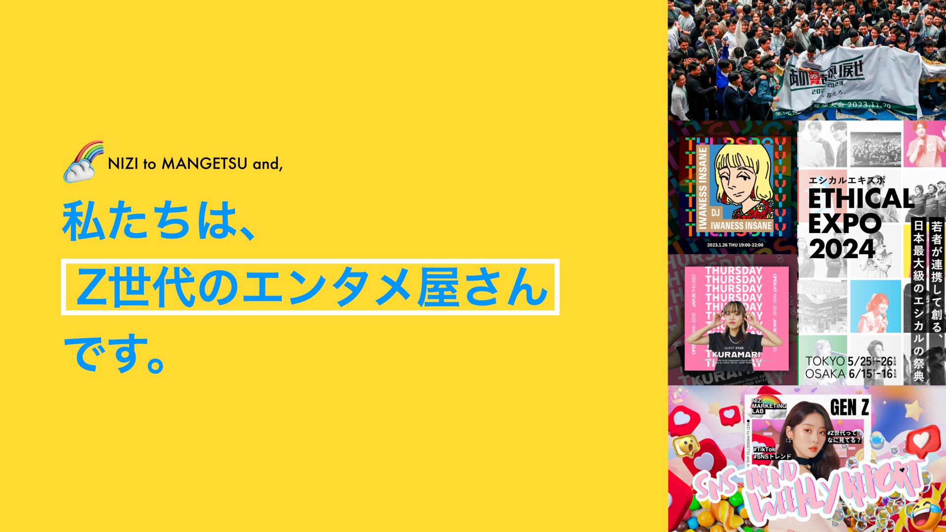 虹と満月と株式会社は、若者向けのコンテンツ制作に特化したZ世代を代表するエンタメカンパニーです。Z世代1.5万人を動員したオフラインイベント、100万再生連発のショート動画制作、自社ブランド、ナイトタイムエコノミーコンテンツ制作など、エンタメを軸に幅広く事業を展開しています。「イケてるメンツたちとイケてるクリエイティブで地球を沸かせる」をビジョンに、大企業から自治体、大学、スタートアップまで幅広く支援しています。