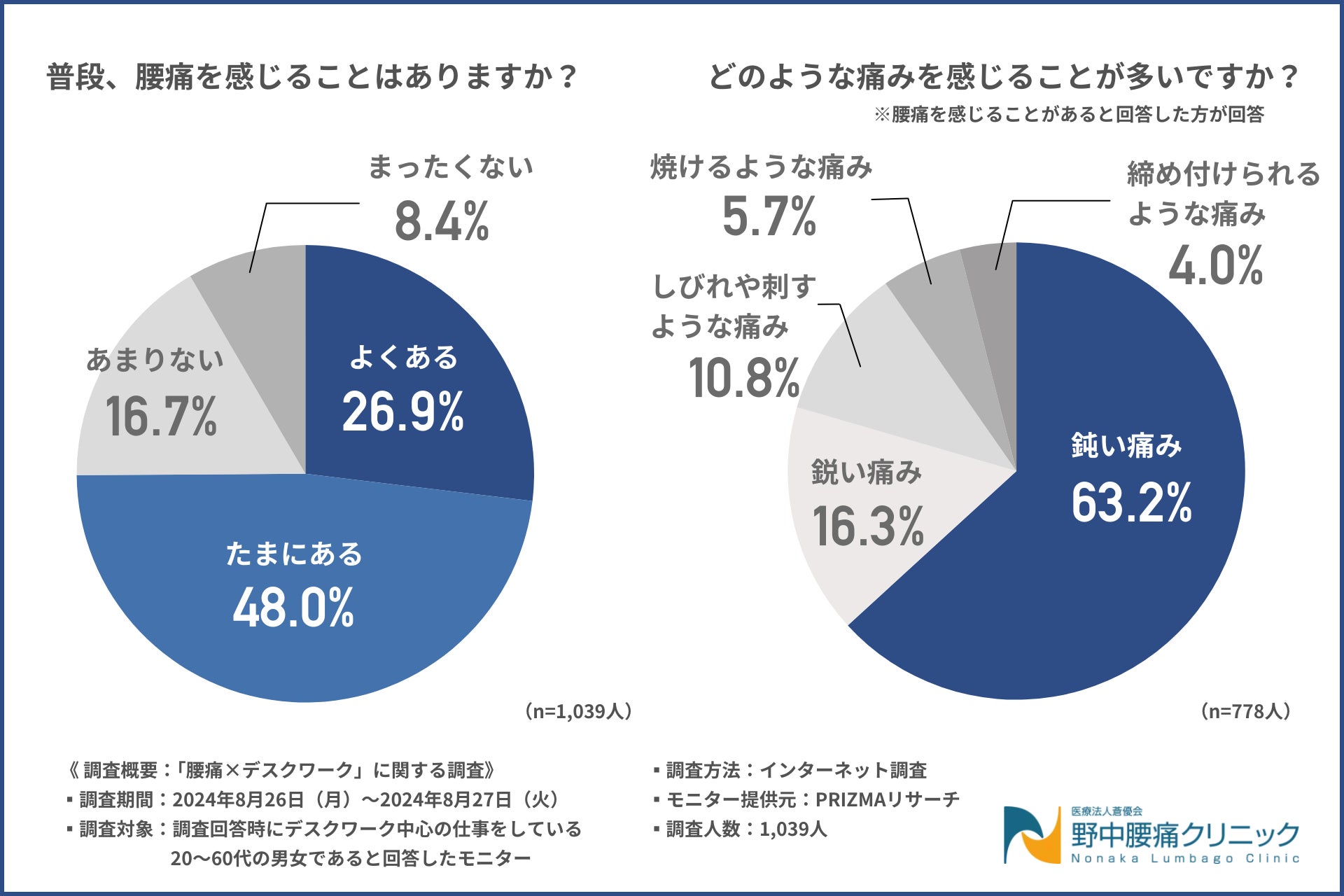 野中腰痛クリニック(所在地:大阪府大阪市東淀川区、医療法人蒼優会理事長:野中 康行)は、デスクワーク中心の仕事をしている20~60代の男女を対象に、「腰痛×デスクワーク」に関する調査を実施しました。