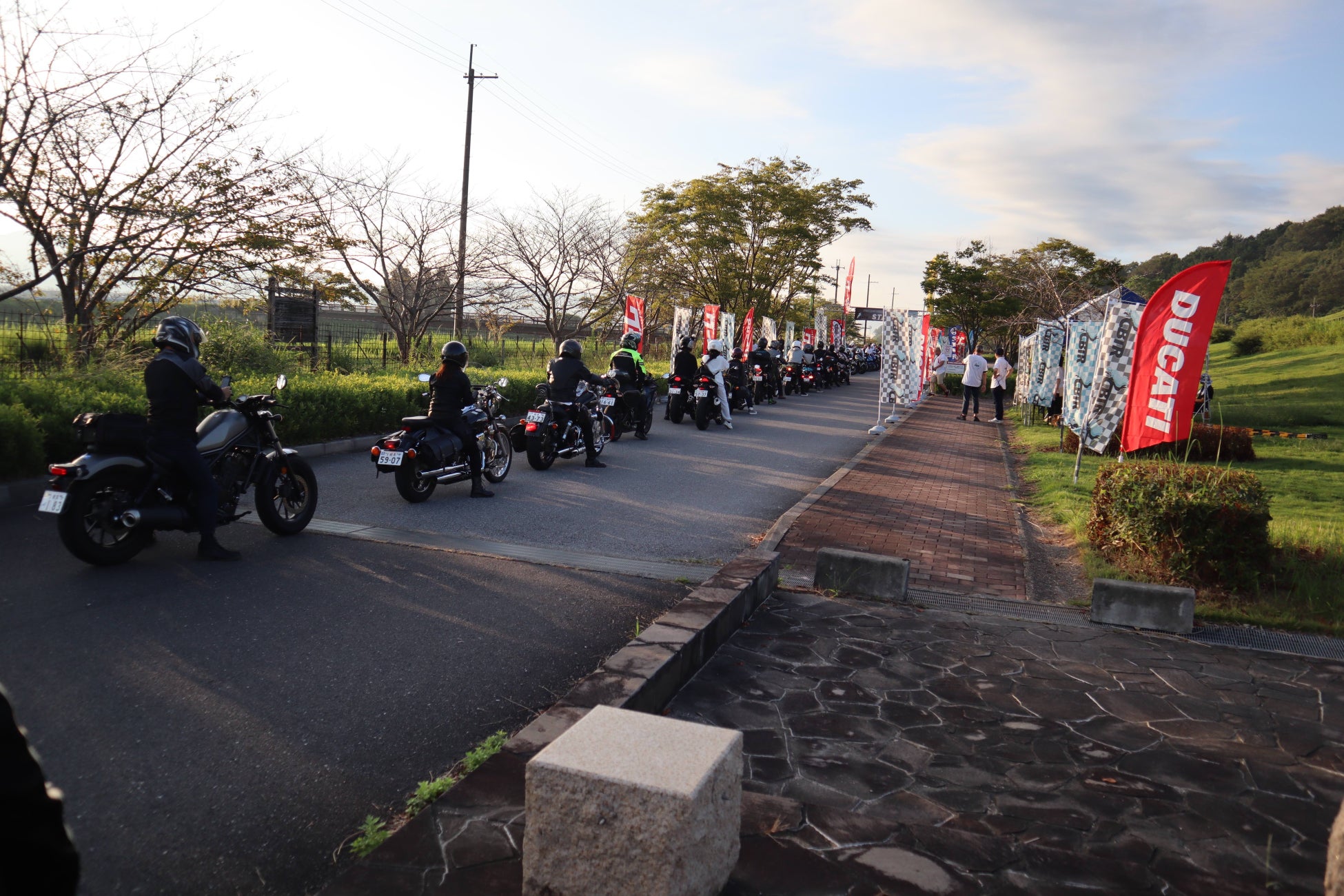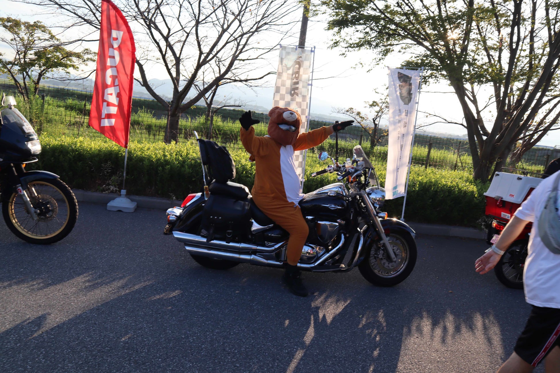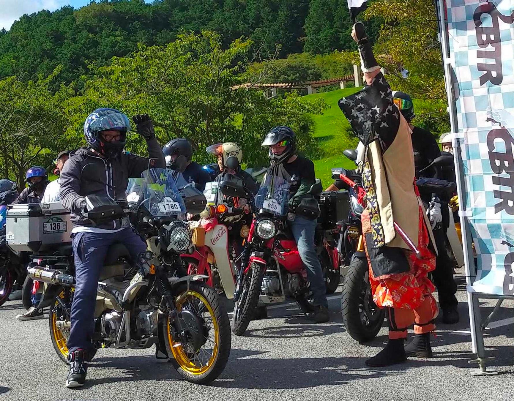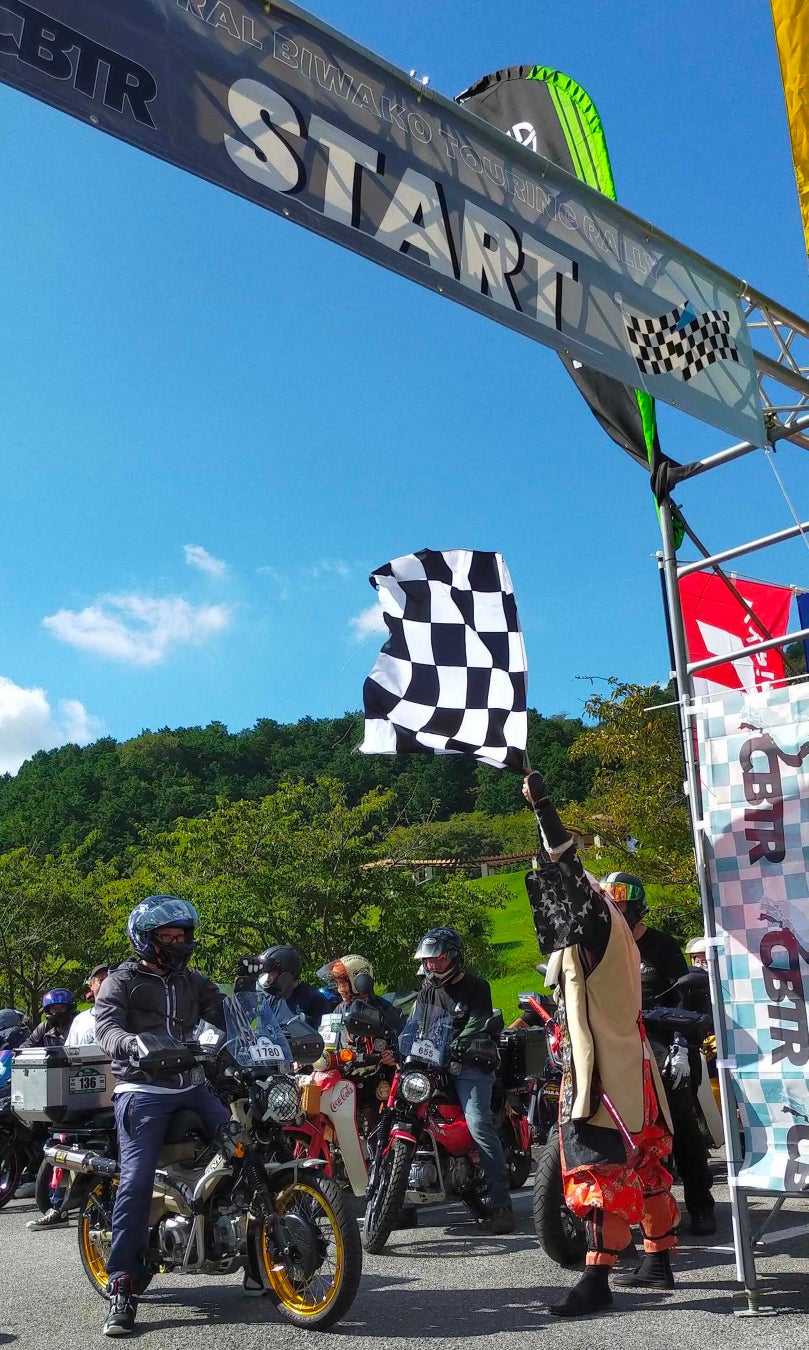 スタートセレモニーの最後に参加ライダー全員での集合写真を撮影したのち、スタートゲートよりいよいよ出走がスタート。今年は彦根武将隊の皆さんがフラッガーを務めてくださり、「出陣じゃー!」の掛け声とともにライダーは各々のびわツー(琵琶湖ツーリング)へと出発されました。