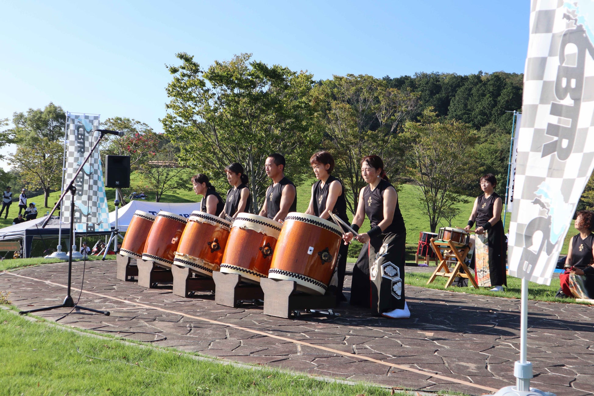 その後の出走イベント中もセンターステージではご当地アイドルマリーナブルーによるパフォーマンス、あづち信長出陣太鼓による演奏など、走り出すライダーを応援するステージが続きました。