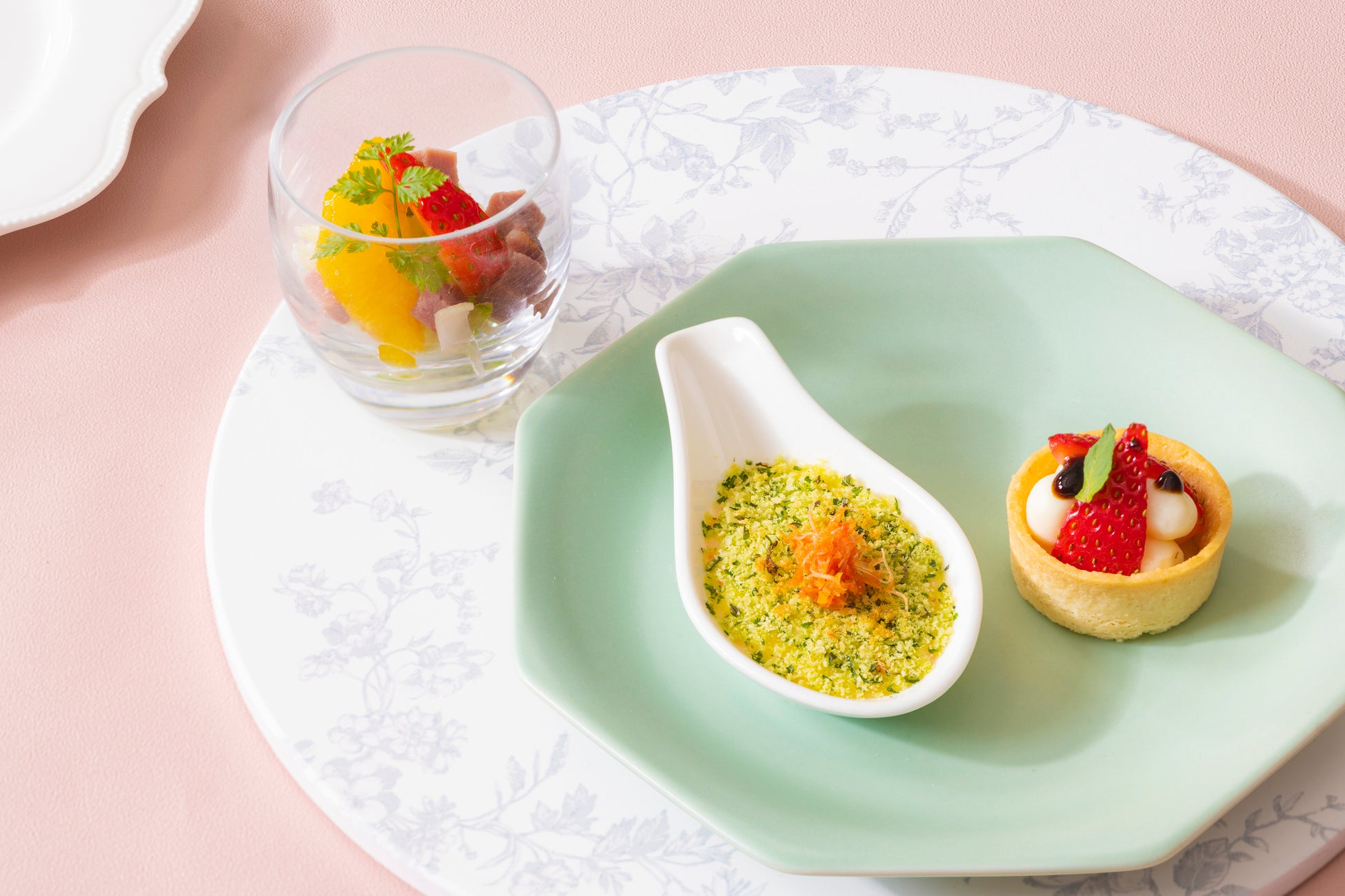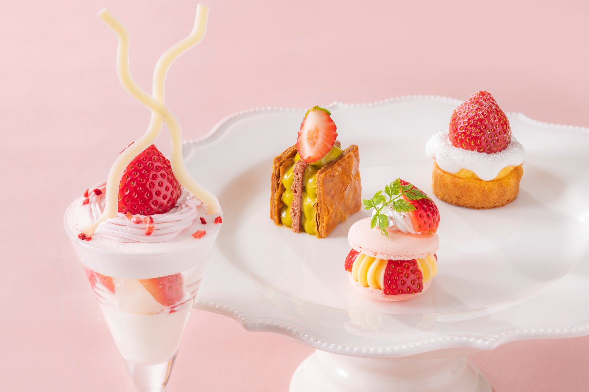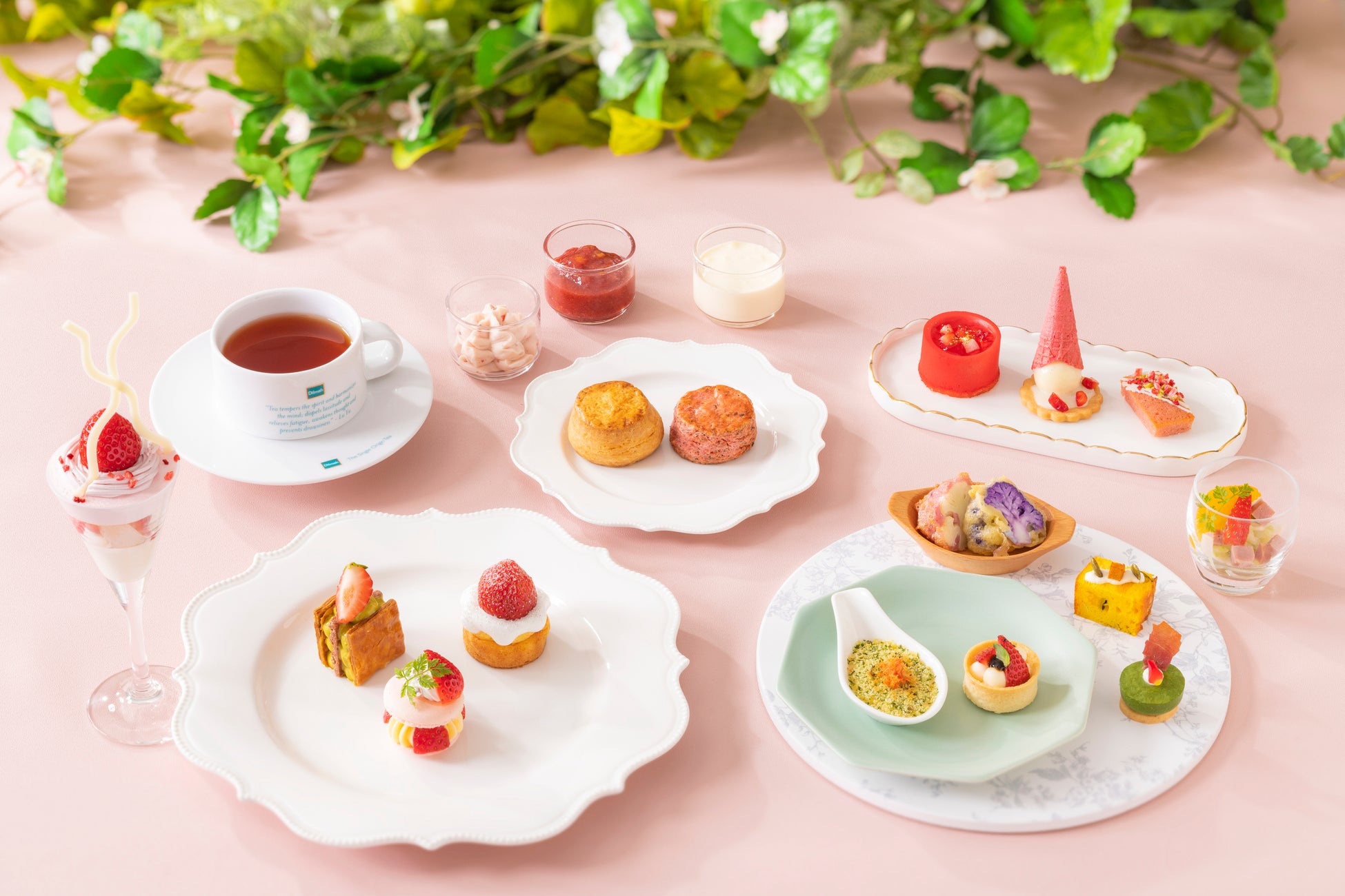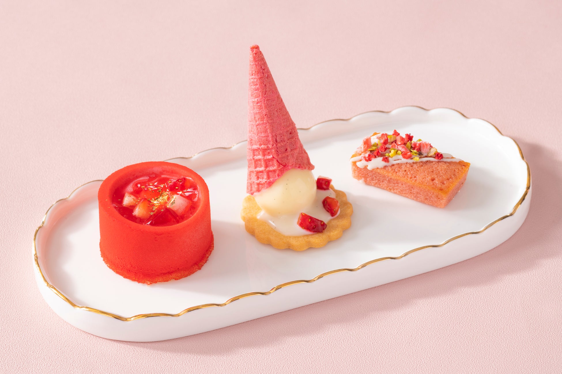 第一弾のスイーツには、コクのある発酵バターとジャージークリームを使用したムースリーヌクリームをたっぷり絞った苺のマカロンフレジェや、キャラメリゼしたサクサク食感のパイに濃厚なピスタチオクリームを挟んだ苺ミルフィーユ、そしてベルガモットの爽やかでフローラルな香りが感じられるホワイトチョコレートのストロベリーコーンなど、全8種類をご用意しました。セイボリーには、苺ドレッシングでさっぱりと仕上げた合鴨の燻製と冬野菜のサラダや、タラゴンが香るズワイガニとリーキのクリーミーなグラタンなど全6種類が登場します。開催期間ごとにフレーバーが変わるペストリーシェフ自慢のスコーンは、第一弾は苺の甘みを引き立てるバジル香るスコーンをご用意いたします。旬の金柑と苺を煮詰めた甘酸っぱいジャムと苺練乳クリームの2種類のコンディメントと合わせてお召し上がりください。