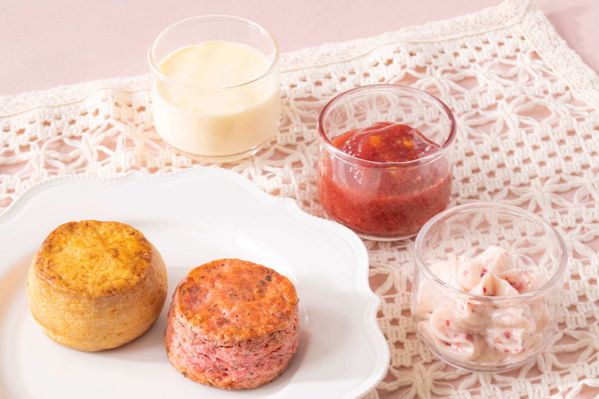 スコーンは、苺とドライバジルを掛け合わせた期間限定スコーンとプレーンの2種類をご用意しました。「苺とバジルのスコーン」は、苺パウダーと香り豊かなドライバジルを練り合わせて焼き上げたお食事としても楽しめるような一品。コンディメントはクロテッドクリームのほか、皮ごとシロップ漬けにした金柑と苺を一緒に炊き上げたジャム、そして苺ピューレと練乳、苺のフリーズドライを混ぜ合わせた練乳苺クリームの3種類をご用意。お好みで合わせてお召し上がりください。