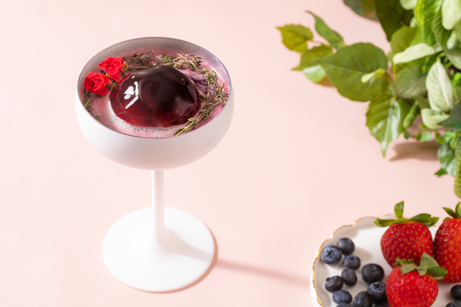 氷でできた花冠をイメージしたスムージーのようなモクテルです。苺やブルーベリーの甘酸っぱい味わいの中に、アールグレイの香りが広がり、ジンジャーコーディアルのピリッとした心地良い辛味の余韻が残る一杯。グラスに浮かべたタイムのさわやかな香りとエルダーフラワーの甘くフルーティーな香りとともにお楽しみください。