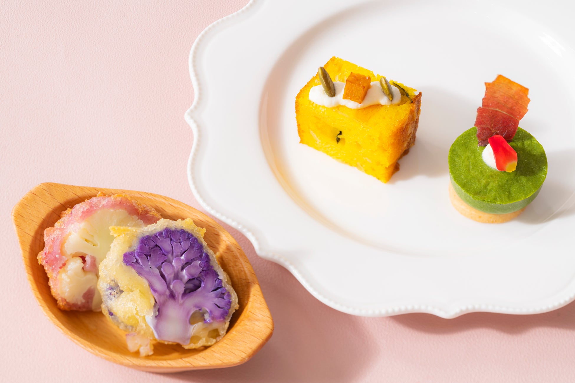 「2色のカリフラワーフリット パルメザンチーズの香り」(写真左下)