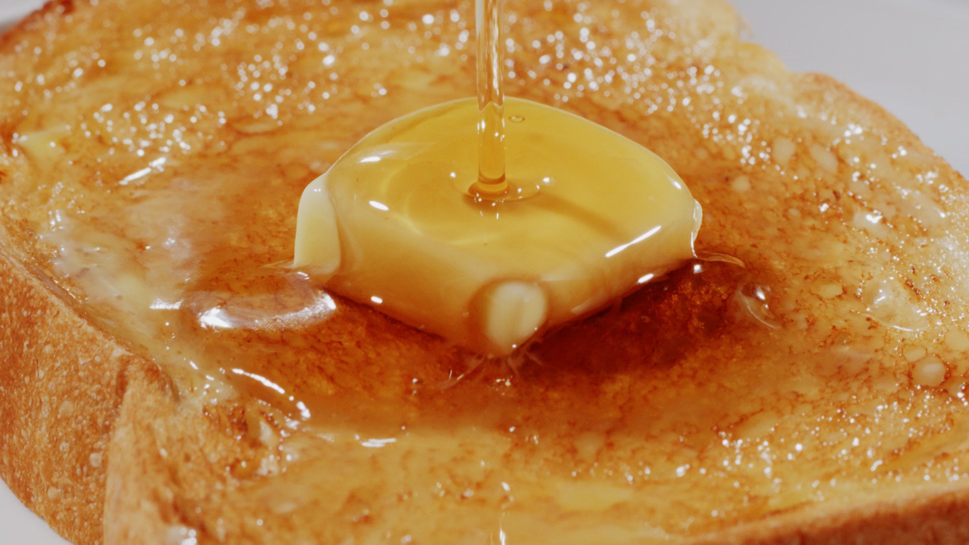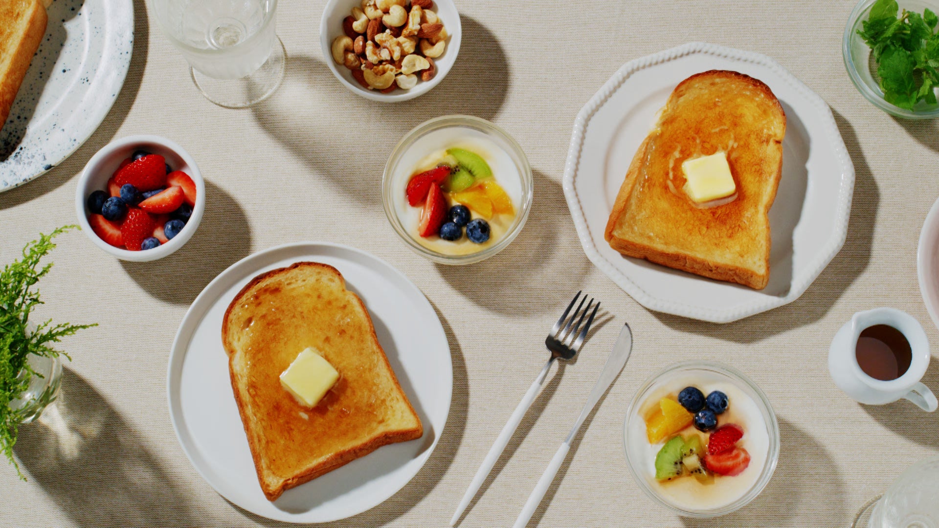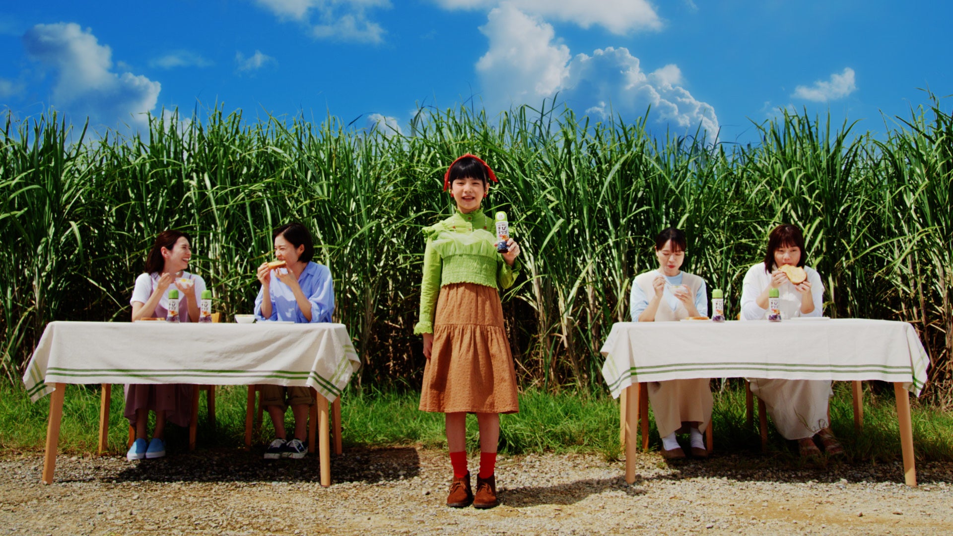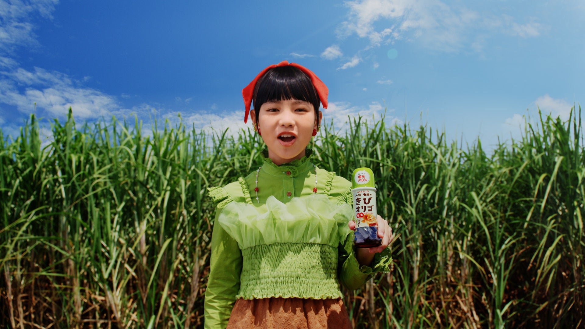 沖縄のさとうきび畑で「沖縄・奄美のきびオリゴ」をかけたトーストを食べるシーンでは、一口食べるごとに広がる、自然な甘みとコクのあるおいしさを表現。合間にヨーグルトやトーストにかけるインサートカットでは、さっとかけるだけで、いつもの食事が簡単にコクのあるおいしさに変わる様子をシズル感たっぷりに演出しました。